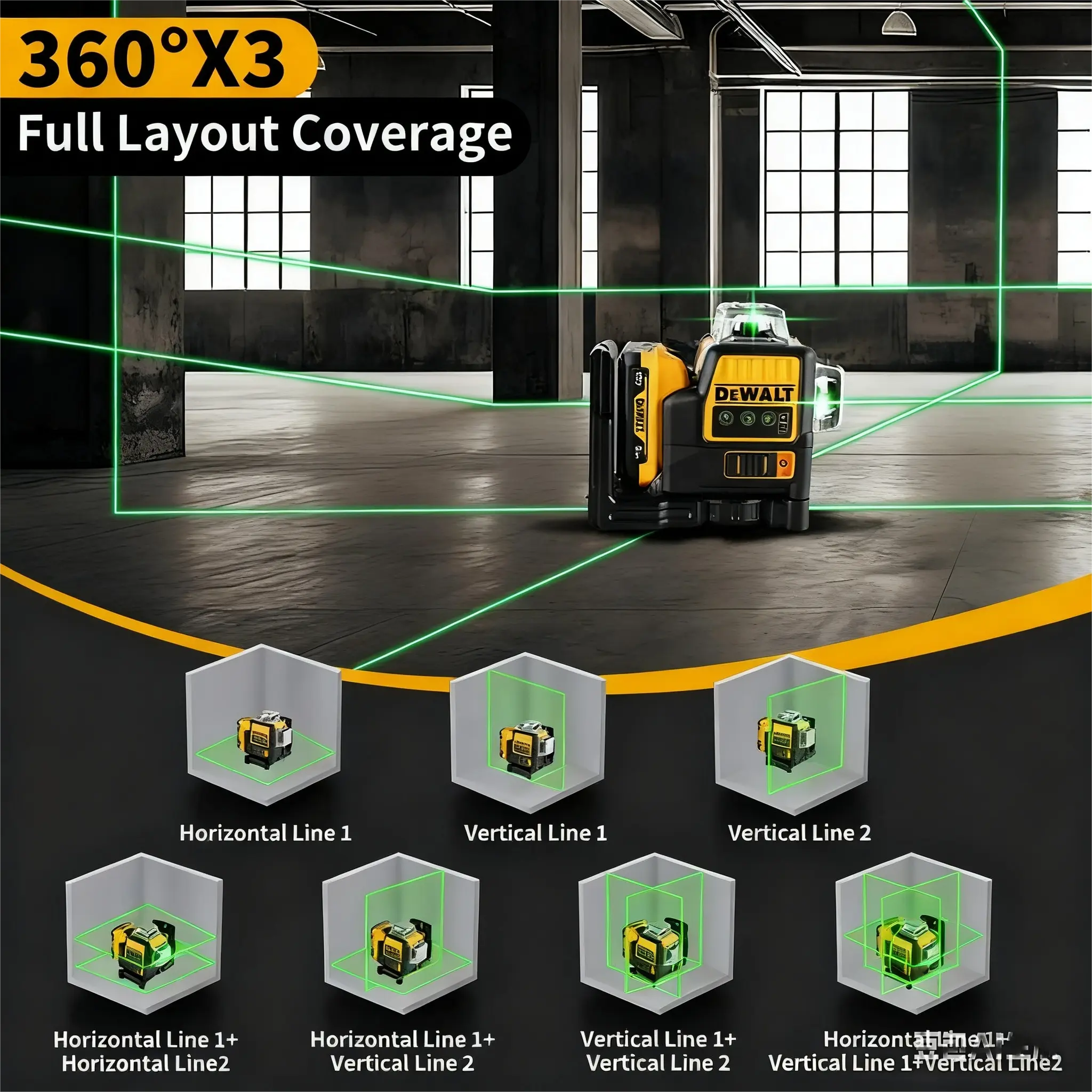 The DEWALT DW089LG offers 12 lines of 360° coverage, ensuring precise measurements for any project. Ideal for DIY enthusiasts and professionals, this tool provides self-leveling accuracy. Perfect for construction and outdoor tasks, it eliminates the need for manual adjustments.