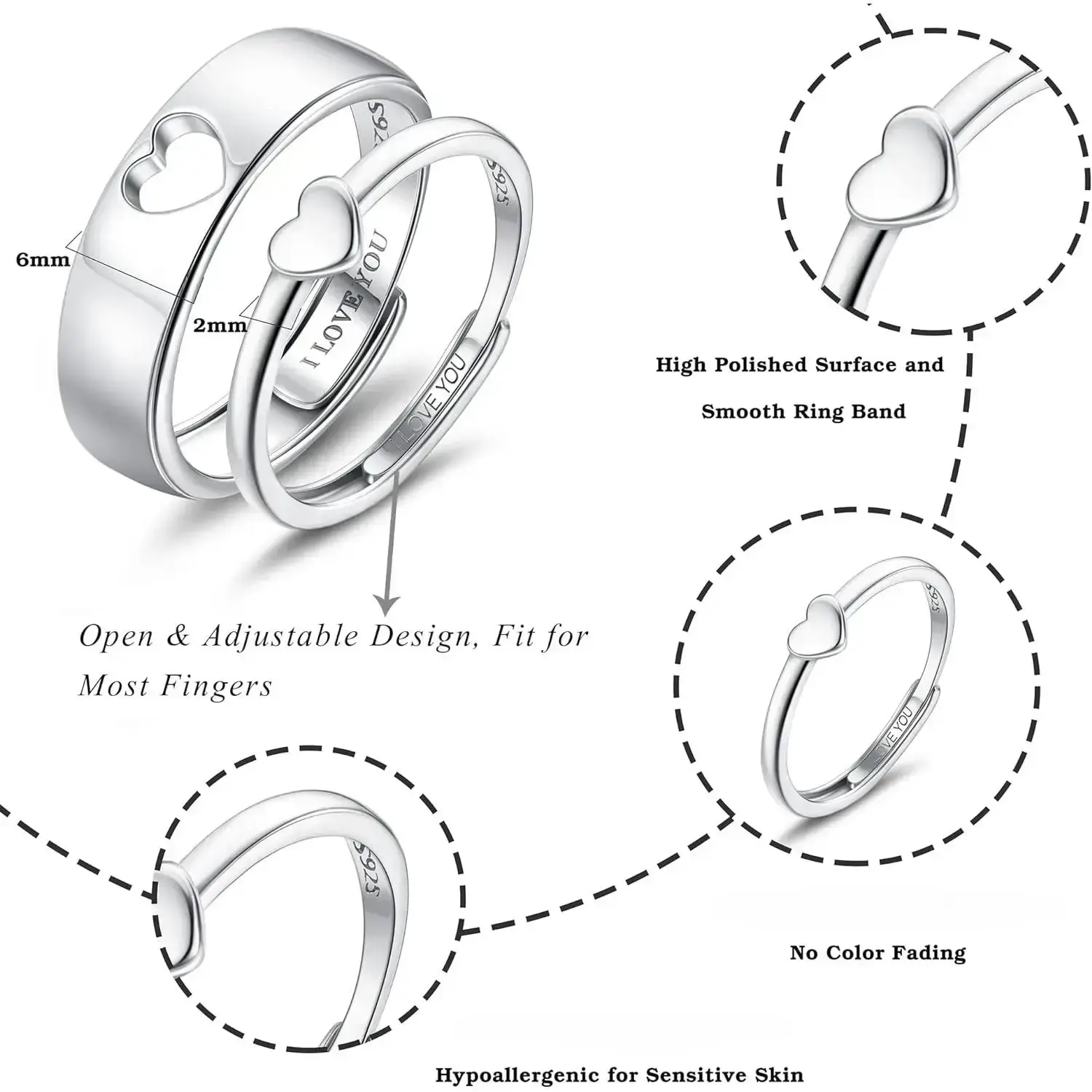 【Matching Couple Rings】: Adjustable matching rings for couples engraved " I Love You " inside, the most romantic words in the world, means no matter what happens and how far the distance between us, i will always love you 【Rings】: These couple rings are no allergies or turn your fingers green. 【Size Info】: Women band width is 2mm, men band width is 6mm, open adjustable design, fits for ring size 6-11. Rings shining surface, finely polished inner band make rings smooth and comfort fit 【Perfect Love Gift】: Come with delicate package, suitable as wedding rings, engagement rings, promise rings, marriage proposal rings on anniversary day, valentine's day, wedding, dating, show you deeply love to her/him, also fit for daily life 【Worth To Have】: You got Milacolato lifetime service. Any problems about matching couple rings, pls contact us without hestitaion, we will try best to make everything right. Just enjoy jewelry's charm Matching Rings for Couples Perfect Love Gift for Her