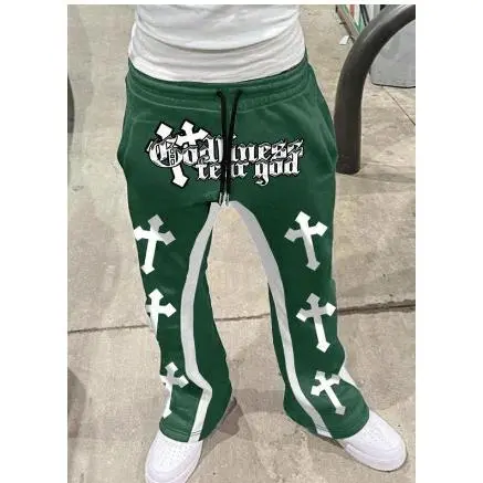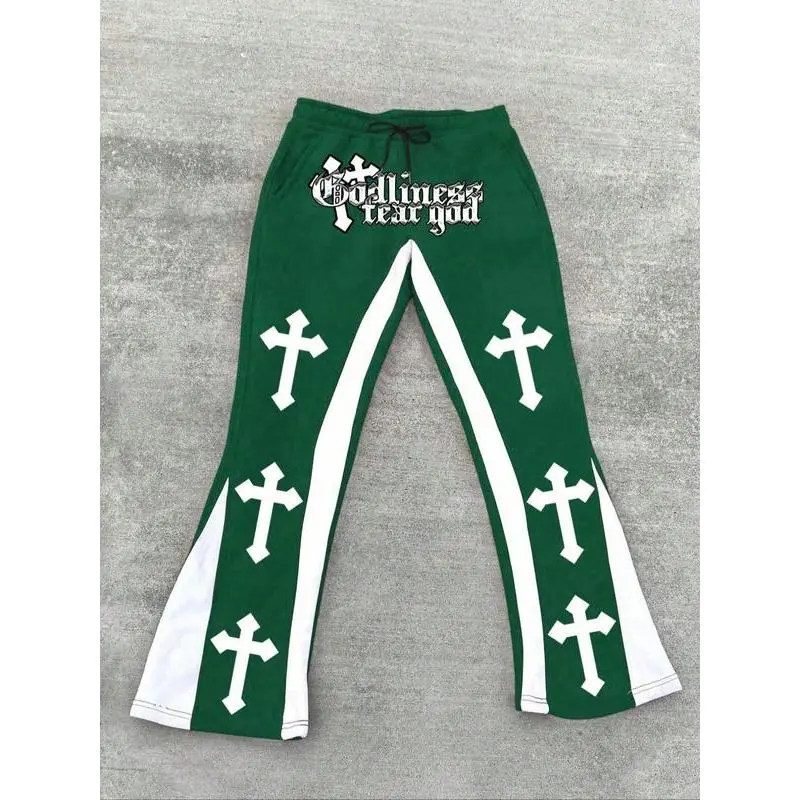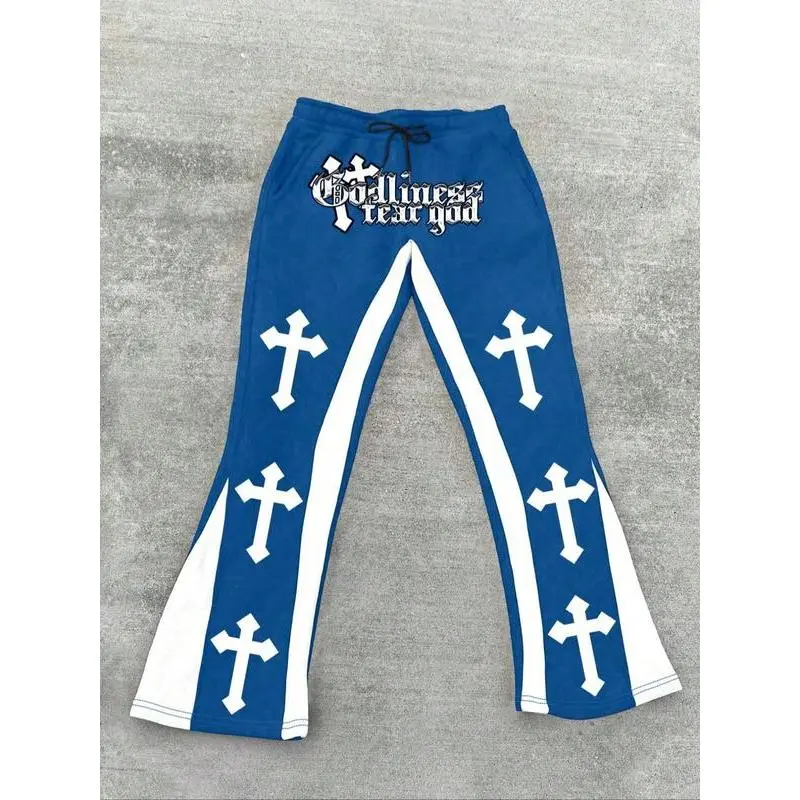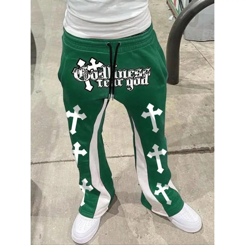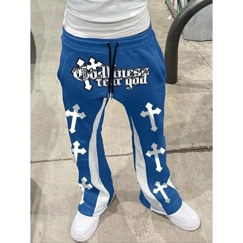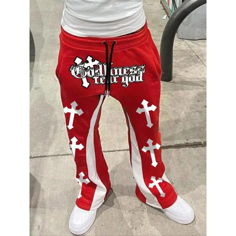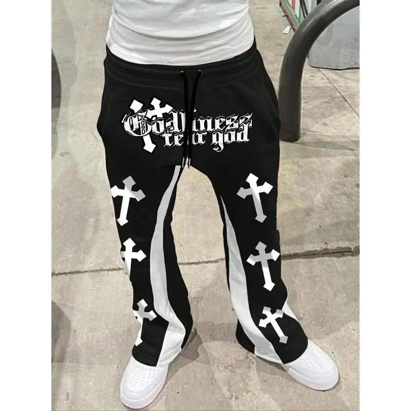 Men's Cross & Letter Print Drawstring Waist Flare Leg Sweatpants, Street Fashion Casual Regular Fit Pocket Trousers for Daily Wear, Men's Bottoms for All Seasons