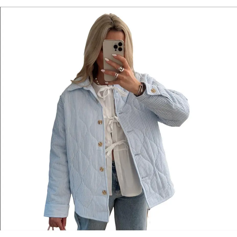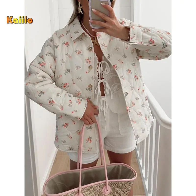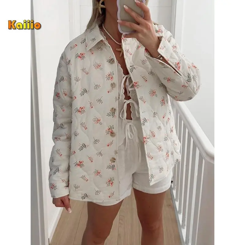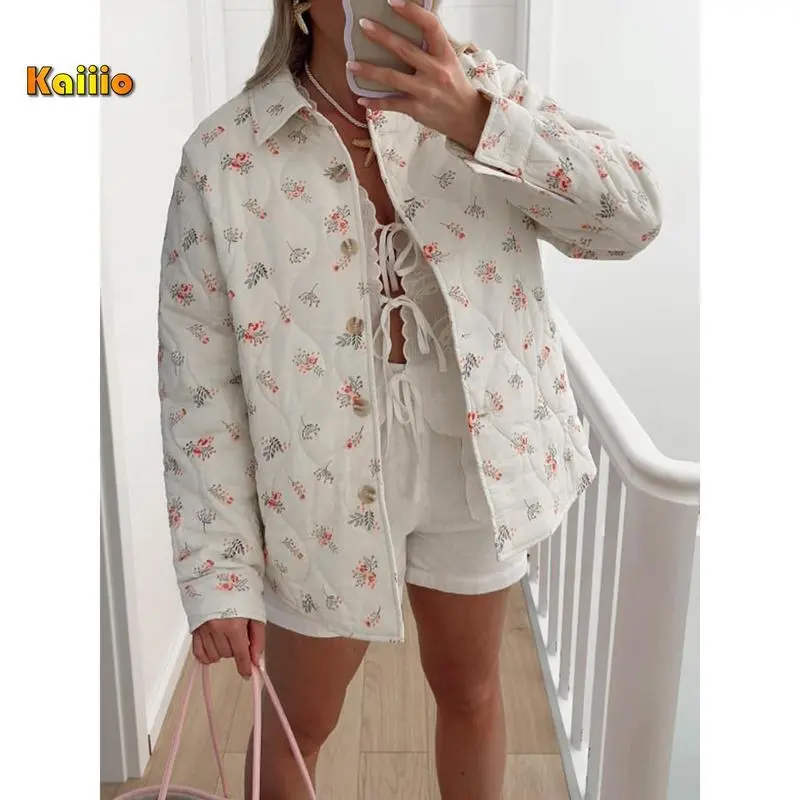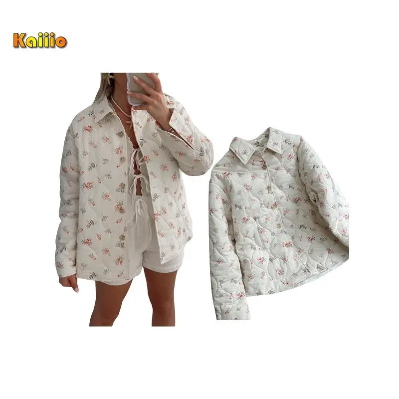 WomenQuiltedJacketLightweightCasualFloralPrintButtonFrontLongSleevesFallCardiganforOutwearStreetwearCottonFashion