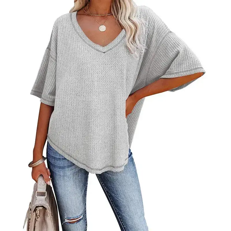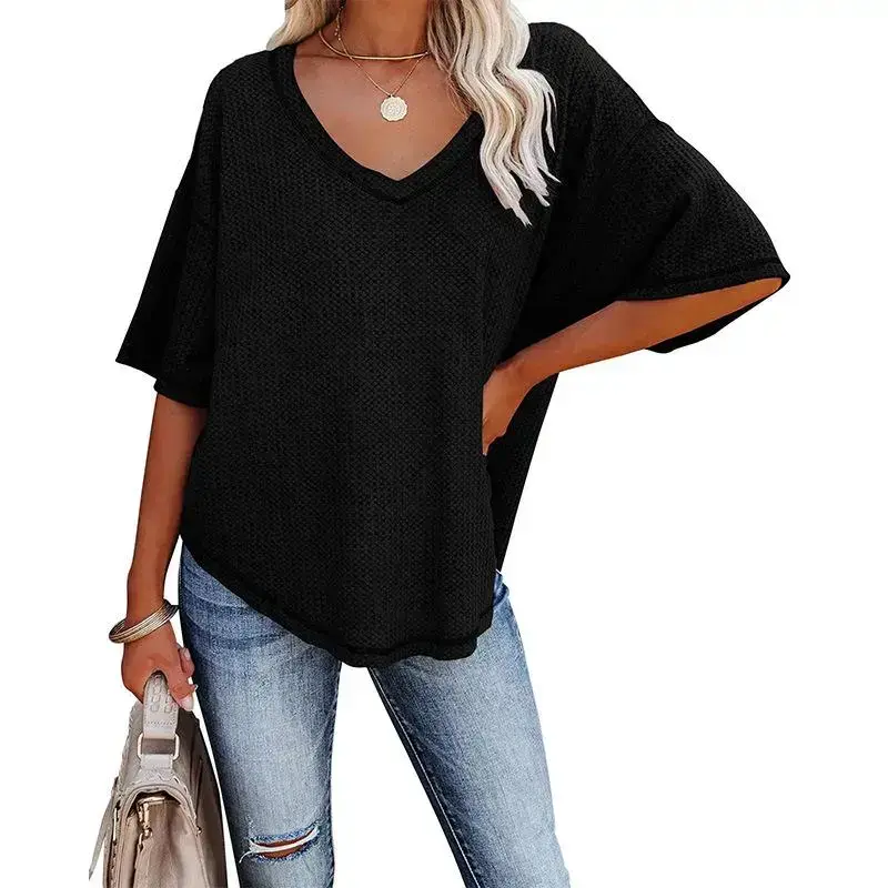 Summer New V-neck Batwing Sleeve Waffle Knit Loose Solid Color Short Sleeve T-shirt Women's Top Womenswear Tshirt