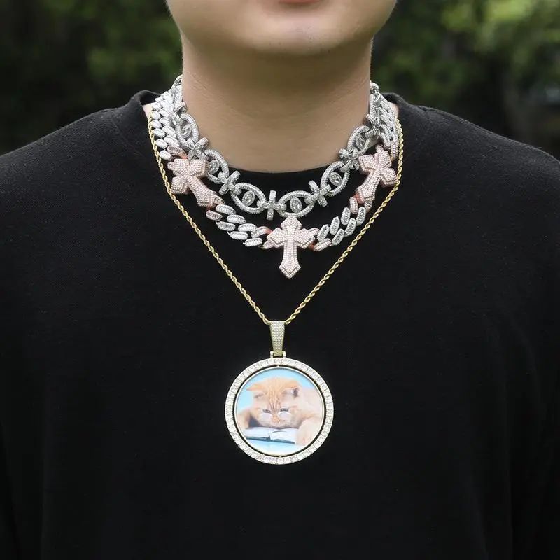 Zircon Rotatable XL Double-Sided Customized Photo Pendant Necklace Punk Style Copper Chain Hip Hop Memory Jewelry