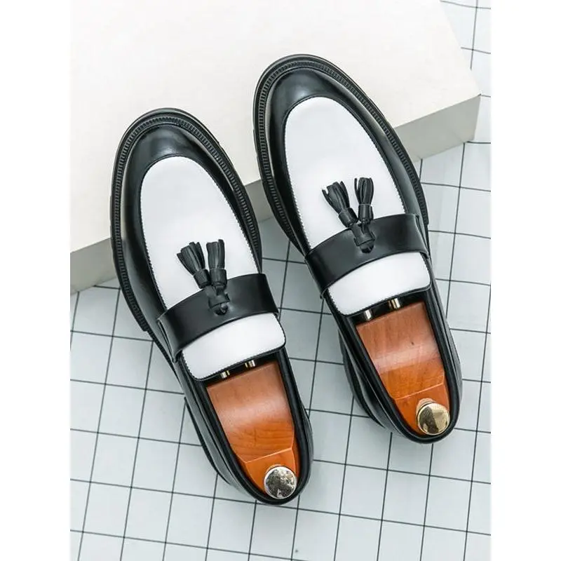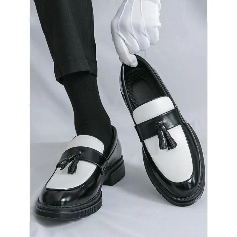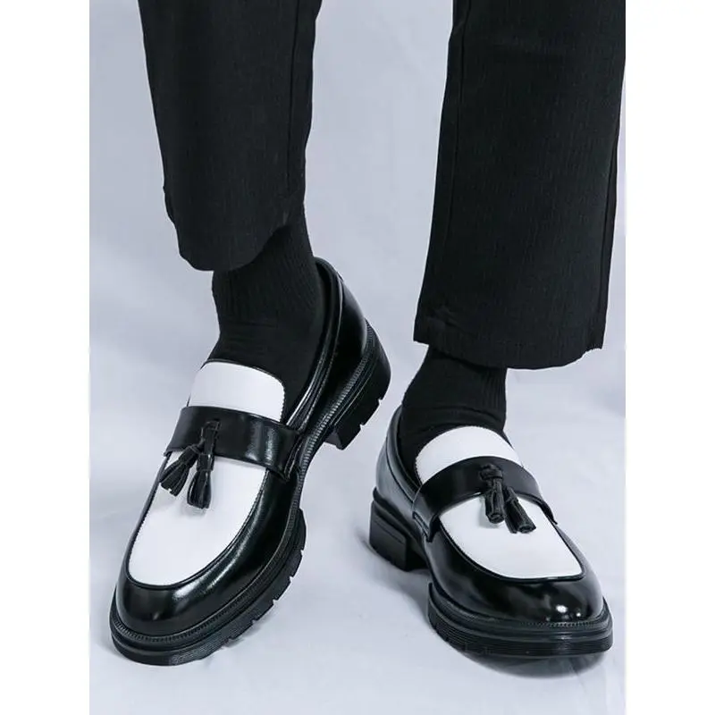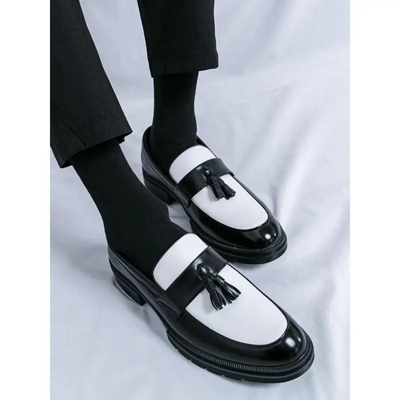 ��Unique Tassel Feature��: The inclusion of tassels provides a distinctive touch, setting these loafers apart from conventional slip-on shoes for men. ��Colorblock Aesthetics��: The dynamic colorblock pattern adds a modern flair, making these loafers an eye-catching addition to your footwear collection. ��Practical Slip-On Style��: Designed for easy on-and-off, these loafers ensure convenience for busy individuals seeking functionality in their footwear. ��Durable PU Material��: Crafted from high-quality PU, these shoes promise longevity and resistance to wear, ideal for daily use and special occasions. ��Round Toe Comfort��: The round toe shape offers ample space for the toes, enhancing comfort, especially during extended wear at events or parties.