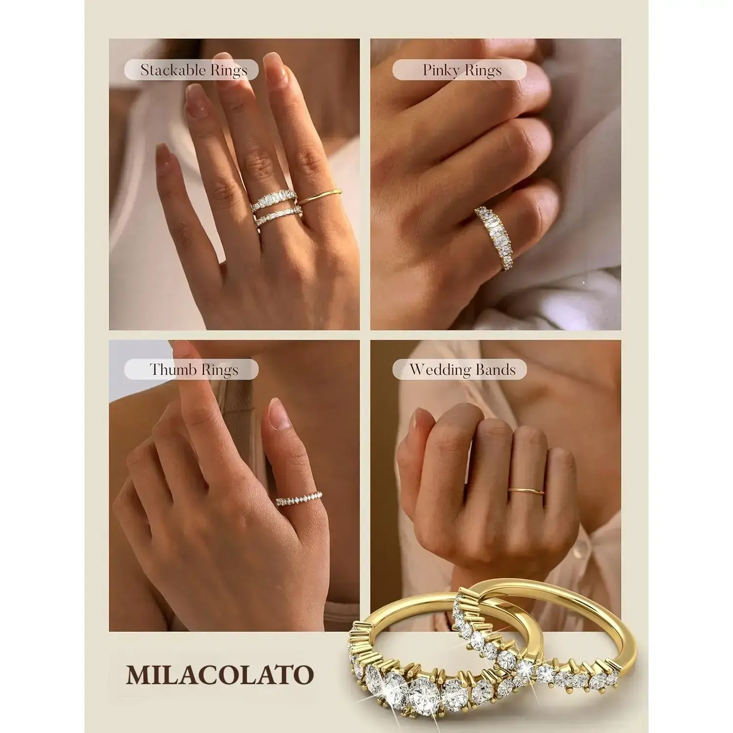 PAVOI 14K Gold Plated Stackable Rings for Women - Dainty Pack of Four Stackable Gold Ring with Cubic Zirconia - Multi-Bands Trendy Jewelry Set