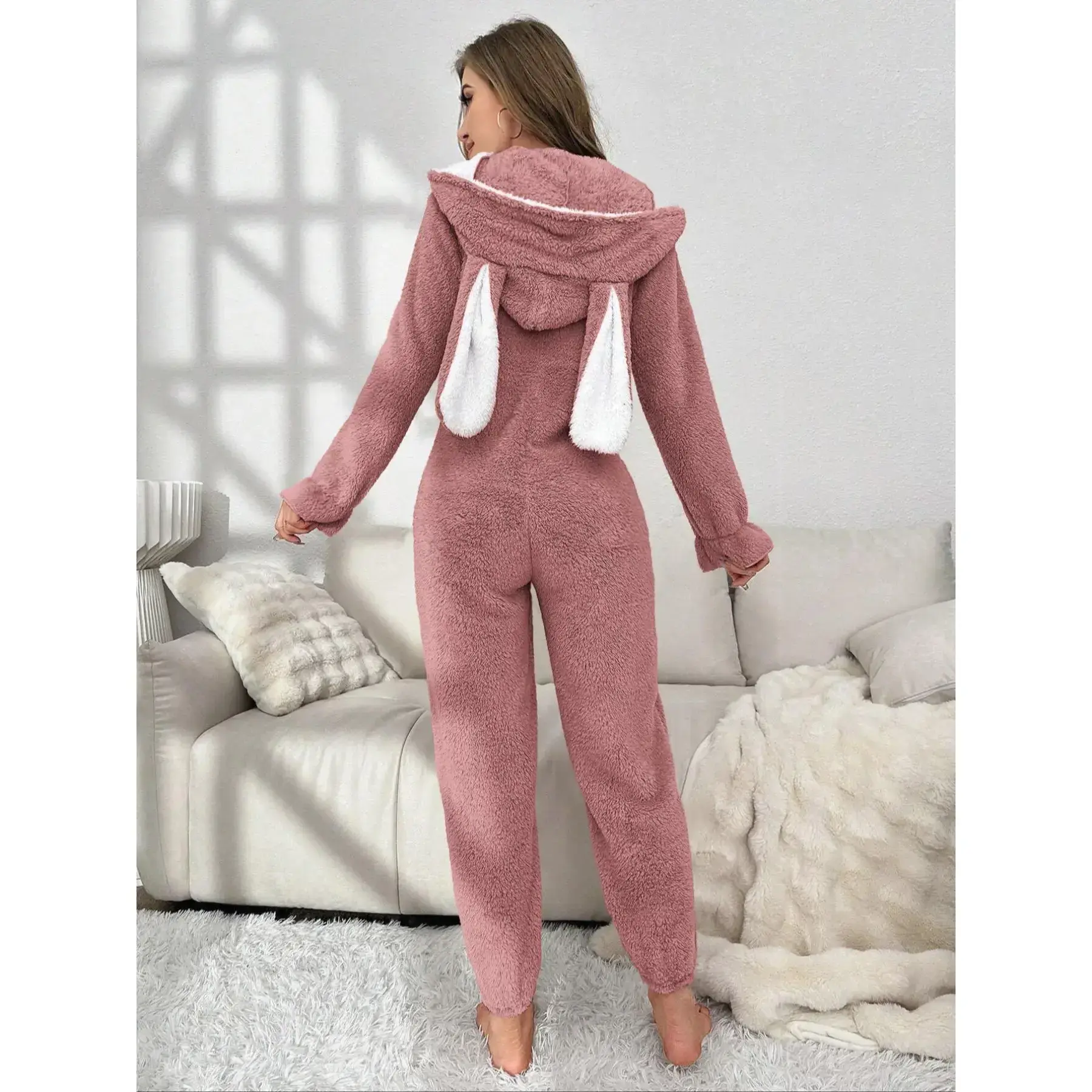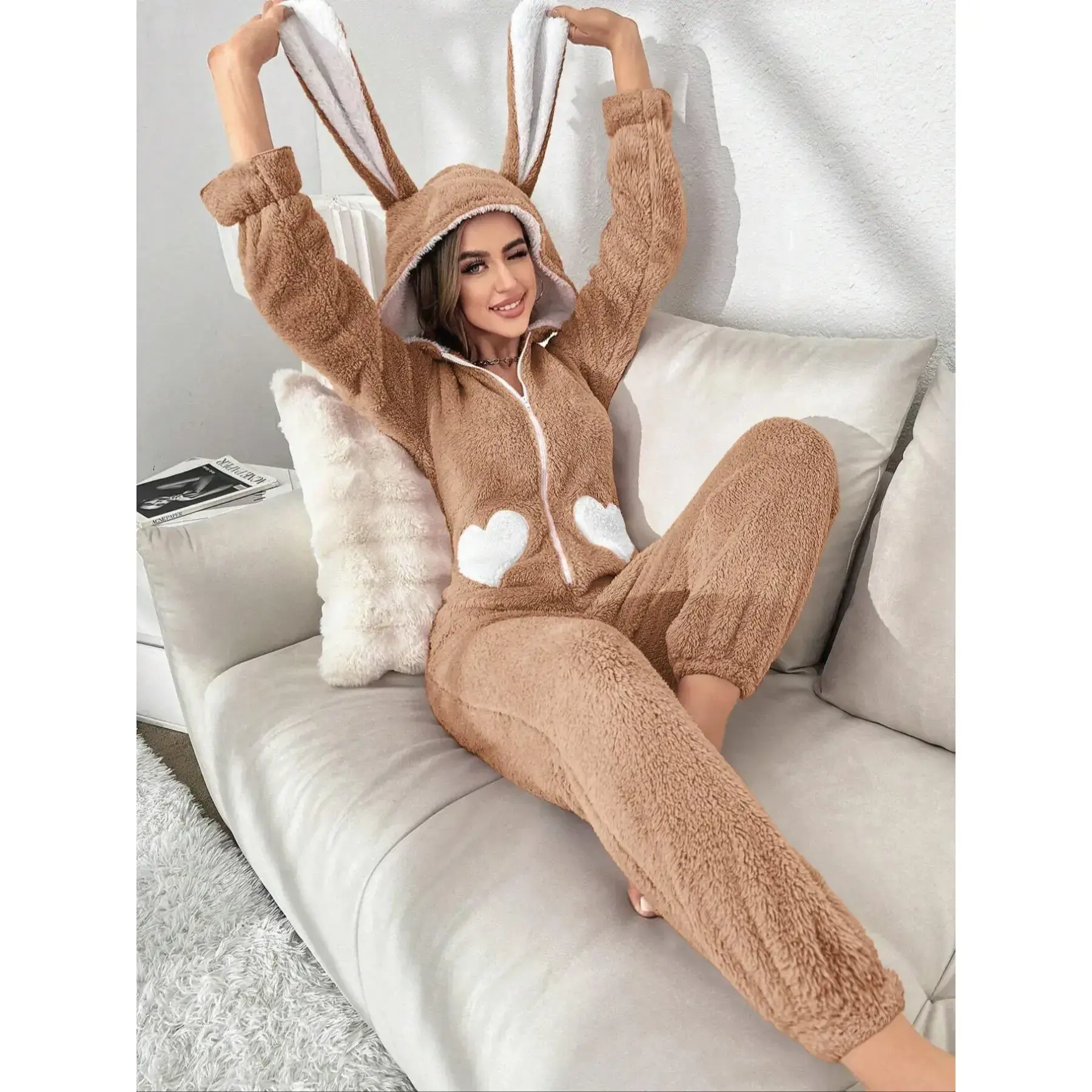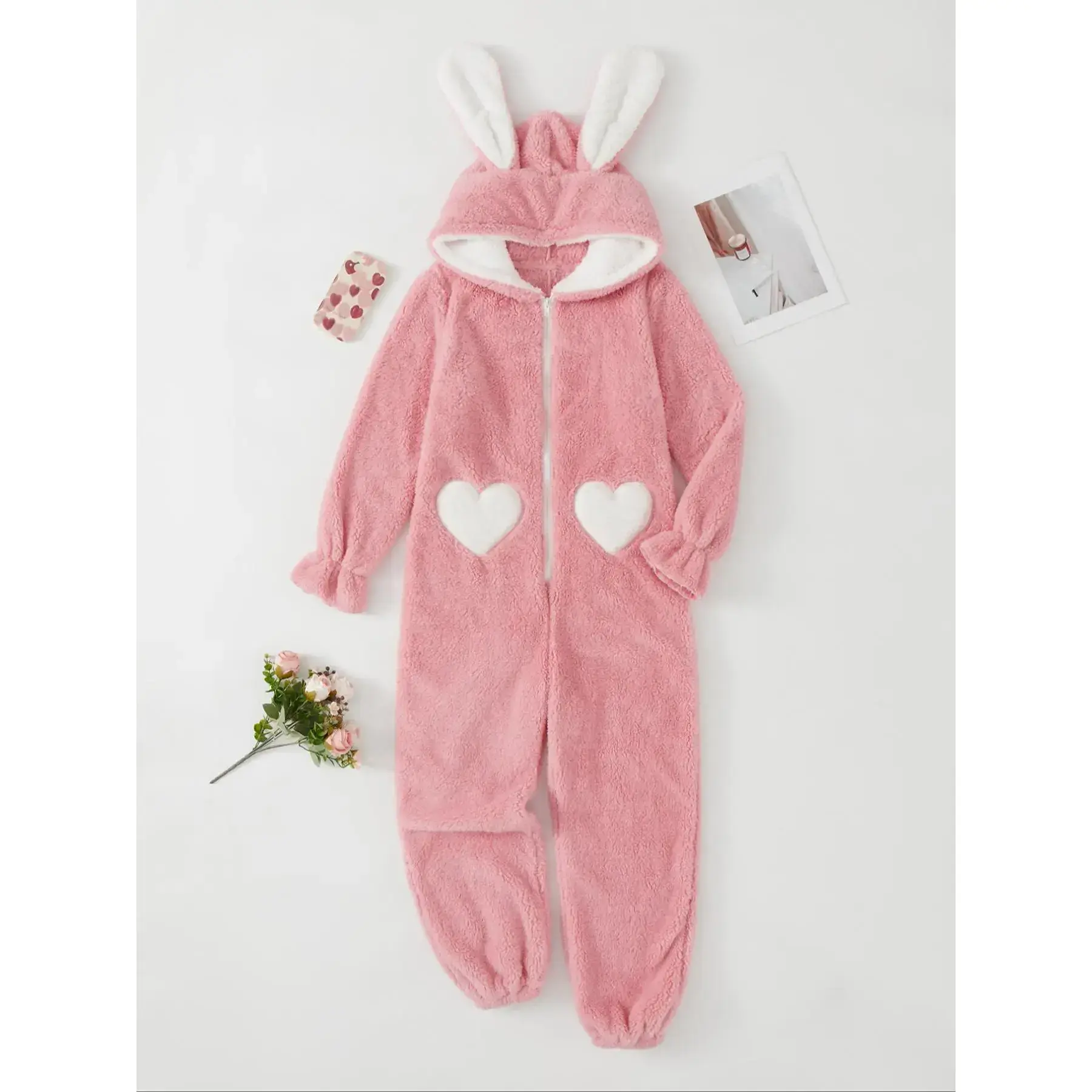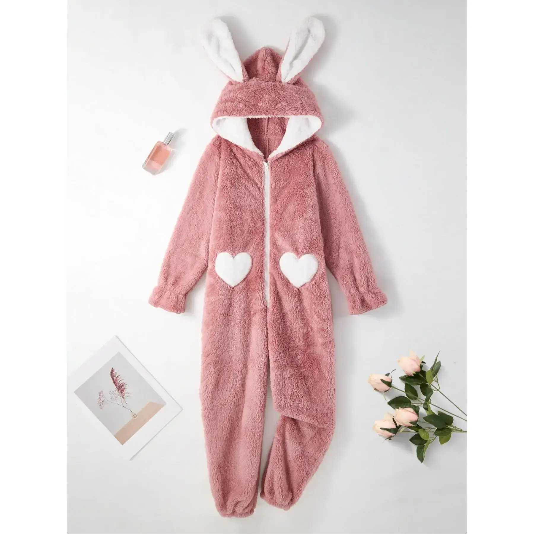 【Unique Rabbit Ears】: The cute rabbit ear design adds a whimsical touch to the traditional onesie, making it a fun choice for lounging at home. 【Heart Pattern】: The eye-catching heart pattern elevates the visual appeal of the onesie, creating a playful and charming look for fall and winter. 【Premium Material】: Crafted from high-quality flannel, this onesie offers warmth and a soft texture, perfect for cozying up during chilly nights. 【Practical Zipper】: The convenient zipper closure allows for easy wear and removal, enhancing the functionality of this lovely sleepwear. 【Care Instructions】: Designed for long-lasting wear, this garment is machine washable and dry clean only, ensuring easy maintenance and durability.