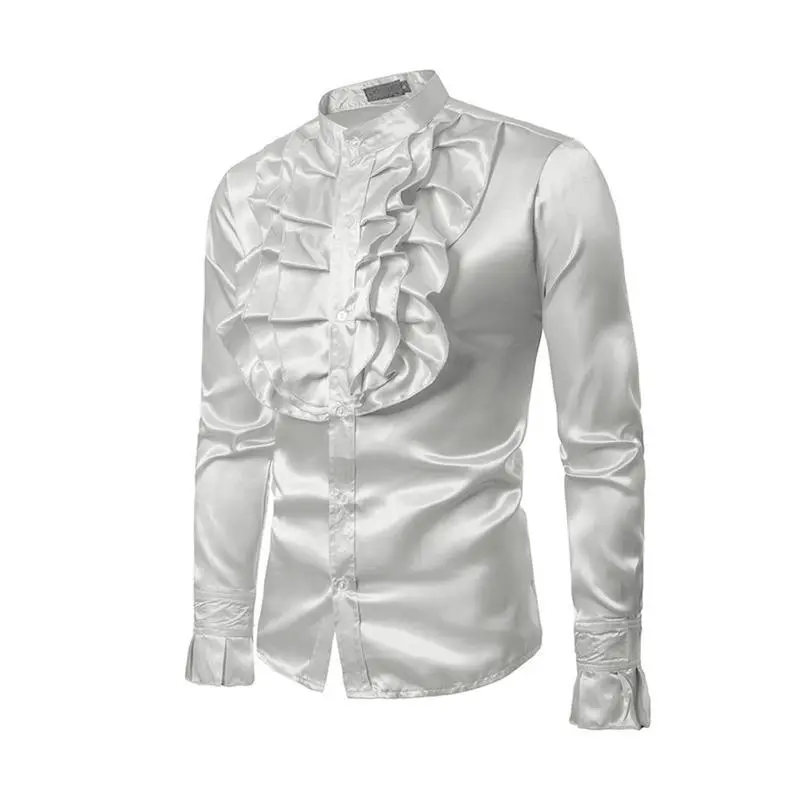 MenSatinRuffleShirtsLongSleeveSilkLikeSatinStandCollarSolidColorFitCasualShirt