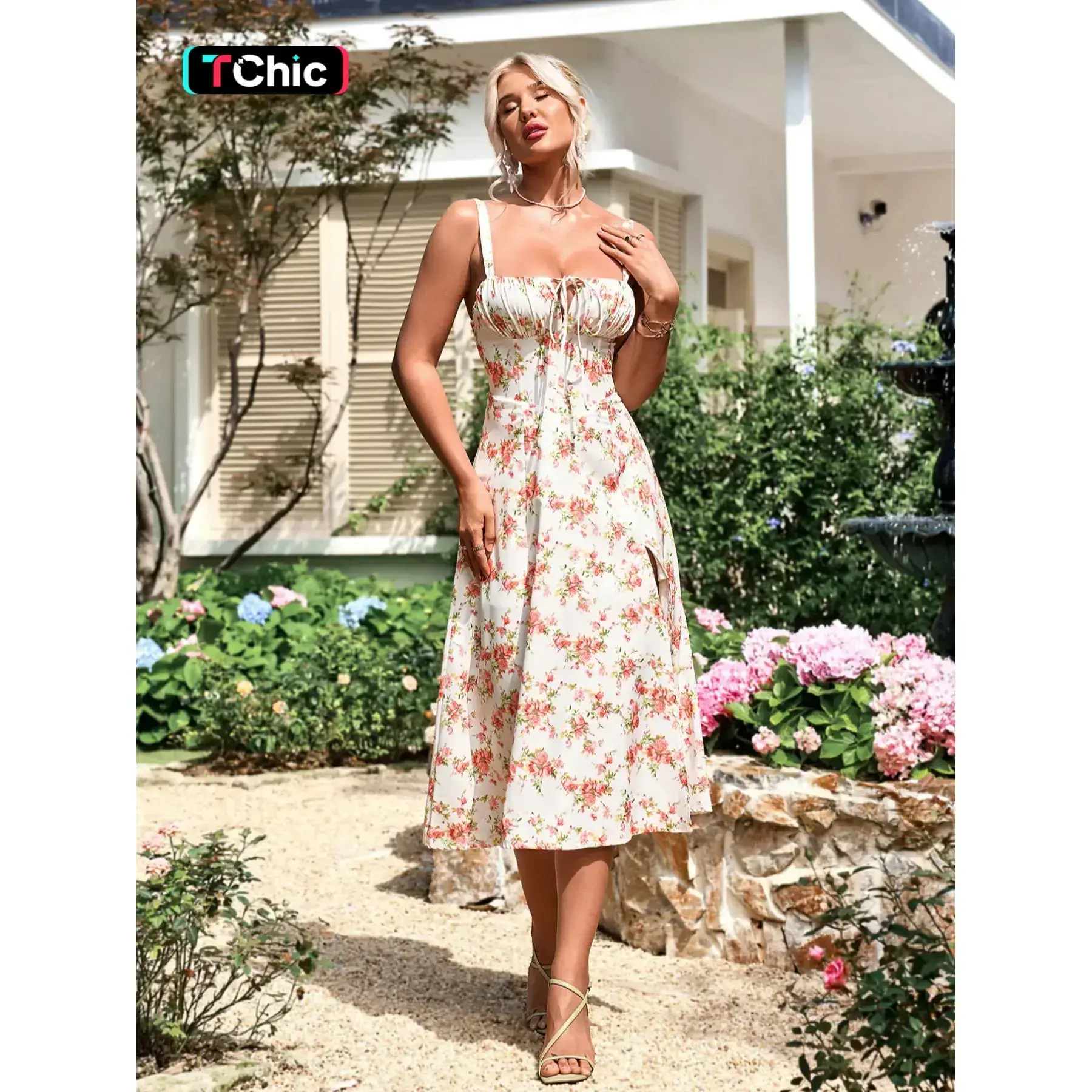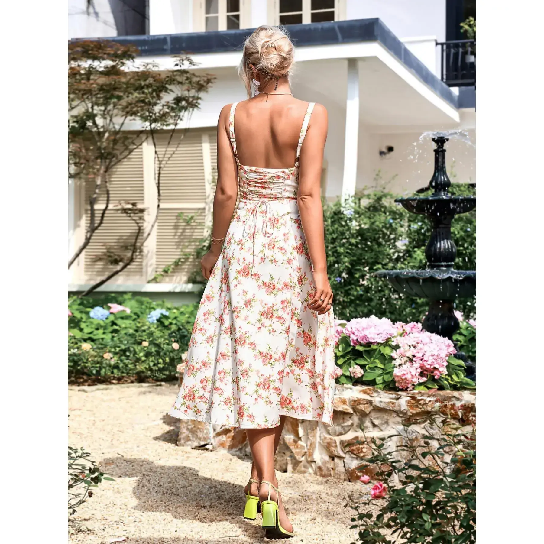 Women's Floral Print Lace Up Split Thigh Vintage Cami Dress, Boning Corset Milkmaid Dress, Boho Style Ruched Details Tie Front Sleeveless Midi Dresses Beach Holiday Vacation, Boho Sundresses, Bohemian Sleeveless