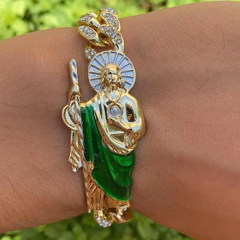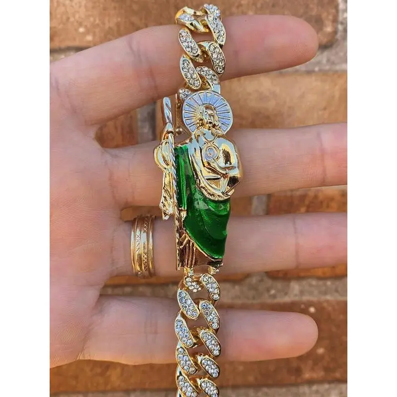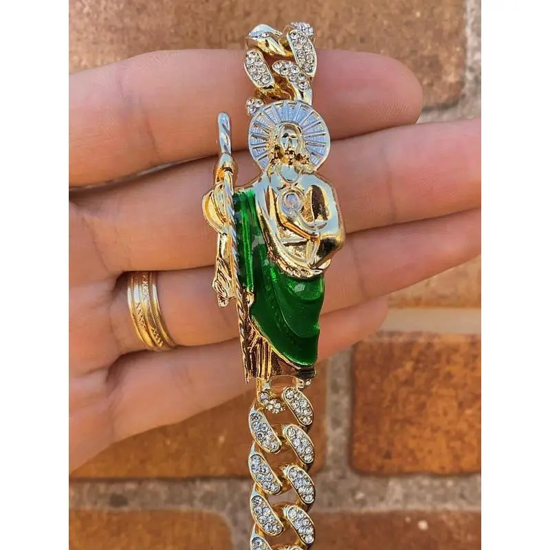 CZ Mens San Judas Bracelet 14K Gold Plated Gifts for Him Everyday Wear Anniversary Birthday Curb Link Chain