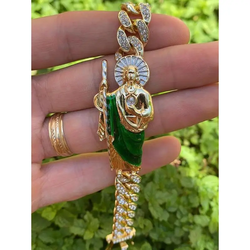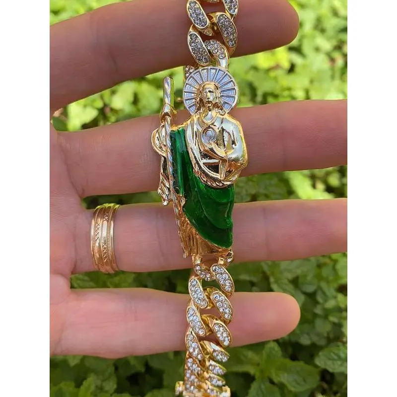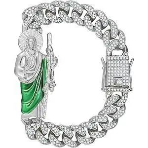 Show your devotion with our San Judas Curb Bracelet, designed to be both stylish and meaningful. This 7.5" inch bracelet is adorned with sparkling CZ stones, adding a touch of elegance to the bold curb link design. Perfect for both men and women. • Material: 14K Gold Plated • Size: 7.5" Inches • Thickness: 13mm • Gender: Unisex • Stone Type: Cubic Zirconia • Stone Shape: Round • Age Group: Adults • Condition: 100% BRAND NEW Add a touch of style and devotion to your look with this San Judas Curb Bracelet - a perfect accessory for any man's jewelry collection.