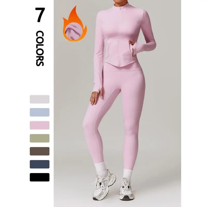 Sporty Two-piece Set Women's Thermal Lined Pocket Zip Up Jacket & Leggings Sports Set, Sports Mock Neck Thumb Hole Outerwear & Skinny Pants Set for Yoga Workout, Ladies Sportswear for Indoor Outdoor Wear, Tracksuit Set