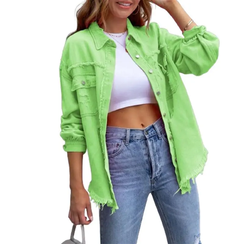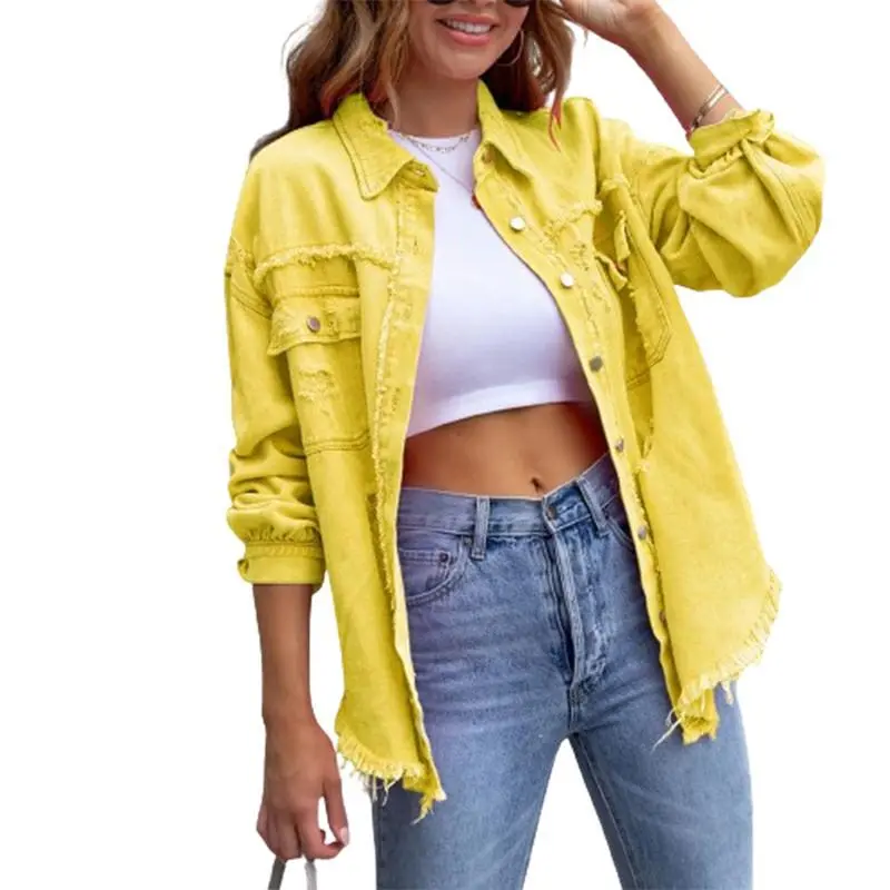 WomenCasualDenimJacketFrayedHemRippedLongSleeveJeanJacketWithPockets