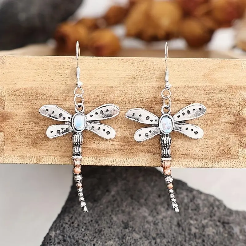 Retro Elegant Dragonfly Dangle Earrings - Drop & Dangle Jewelry with Translucent Glass Decor, Zinc Alloy, Silver Plated, Creative Female Gift, Unique Accessory for Women