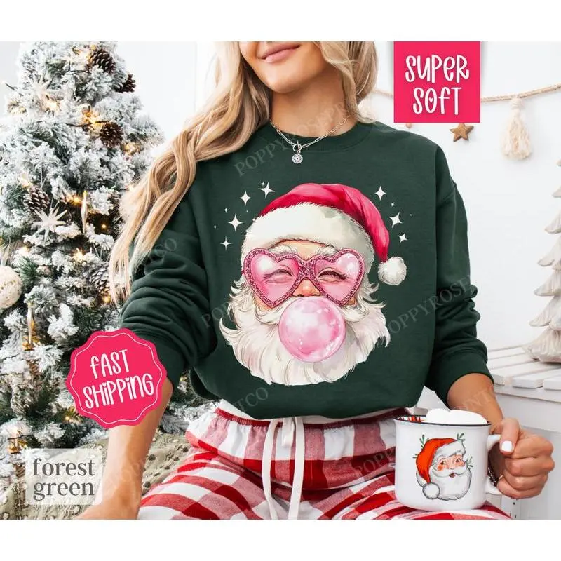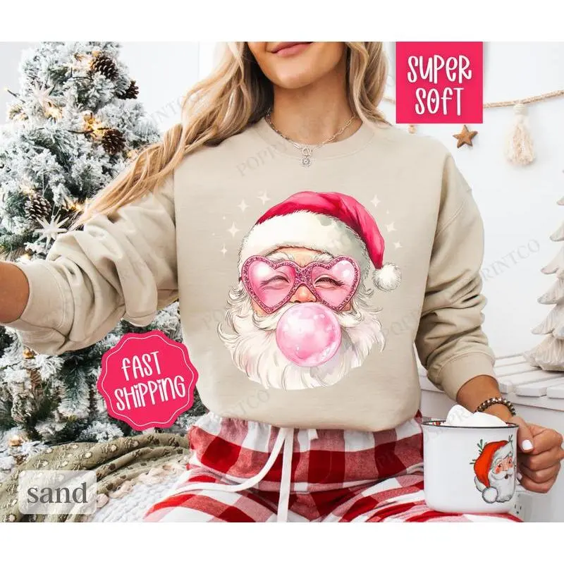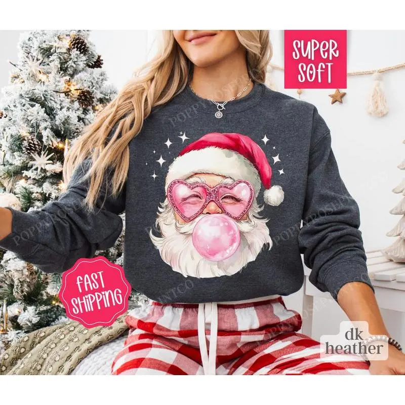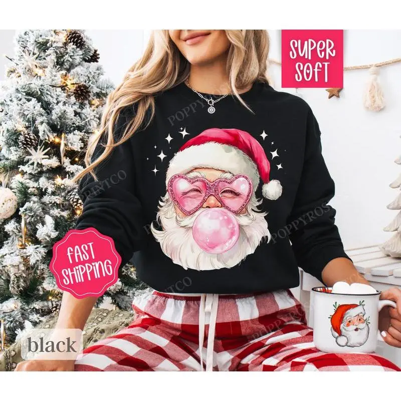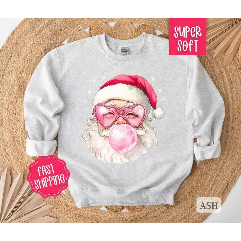 PinkSantaBubbleSweatshirt,ChristmasSweater,CoquetteXmasTshirt,Women'sHolidayCrewneckfunnysanta