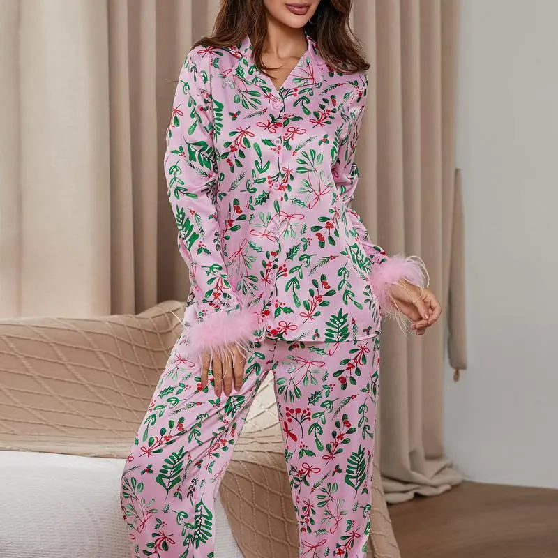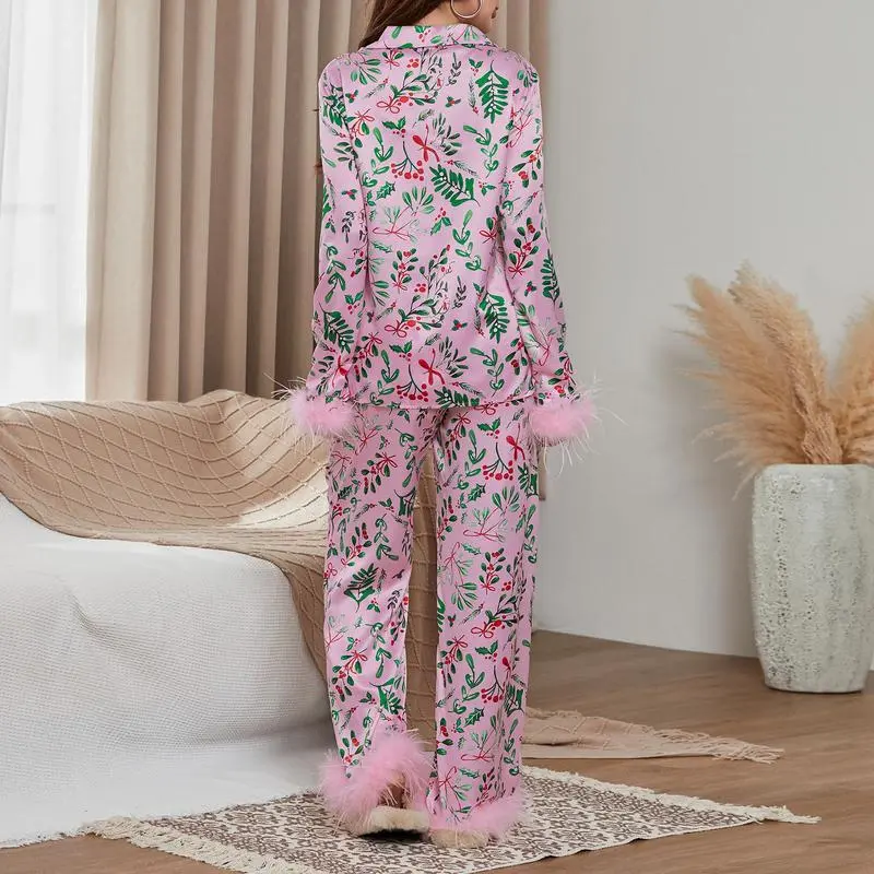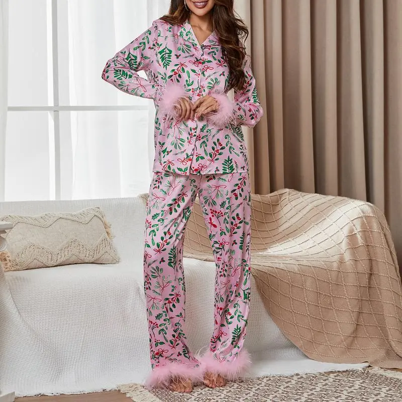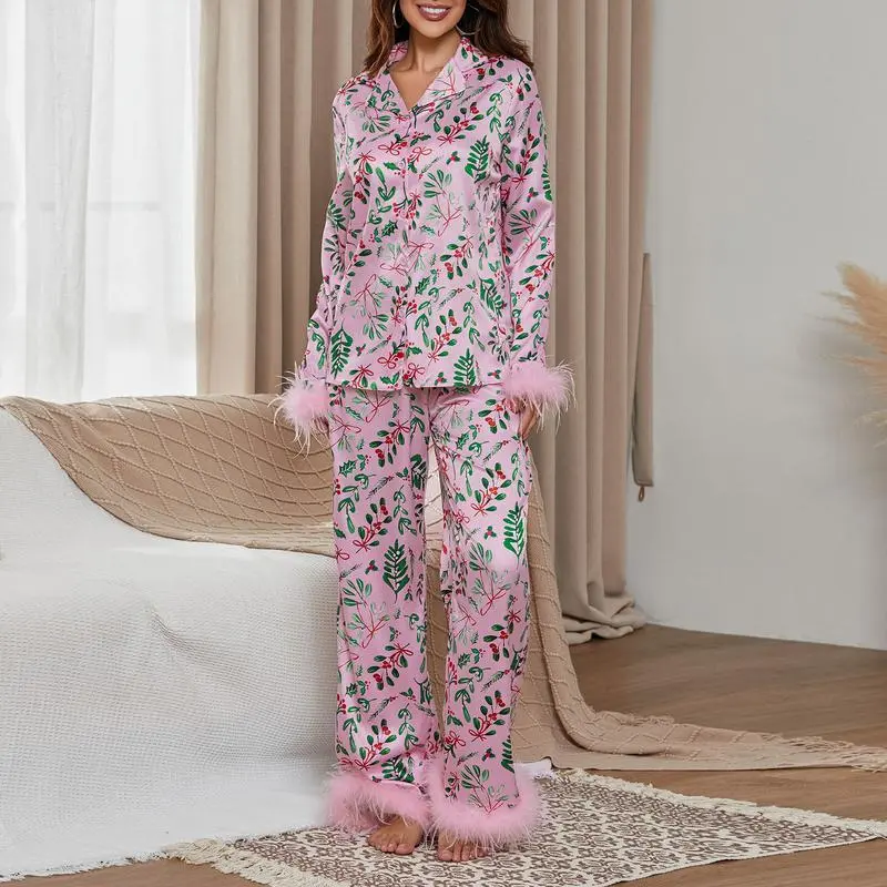 Mommy and Me Matching Pajamas Christmas Feather Trim Pajama Set 2 Piece Shirt Pants Sleep Sets for Mother Daughter Clothing GirlsGift
