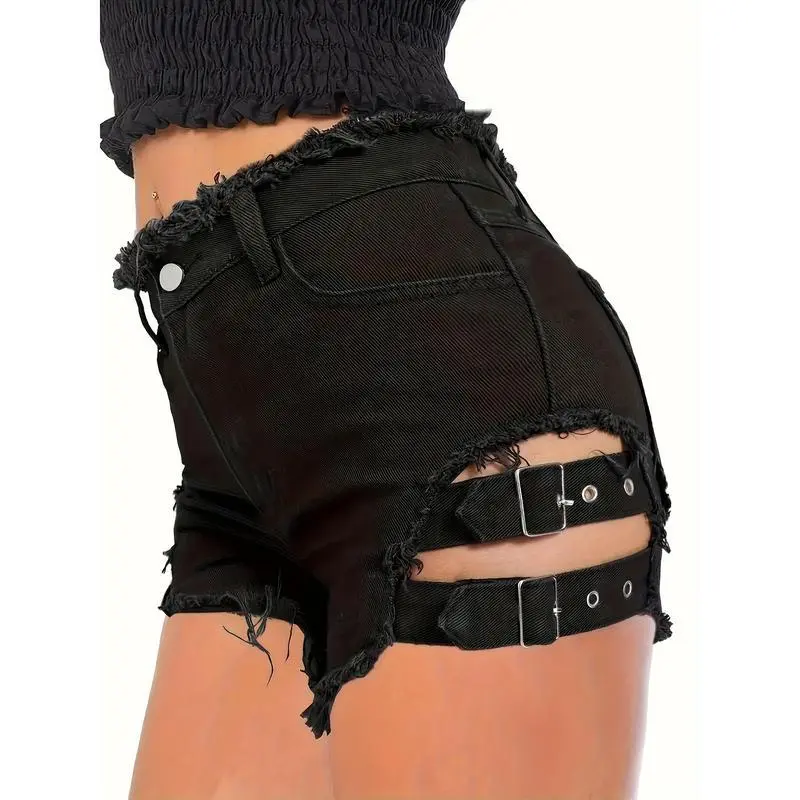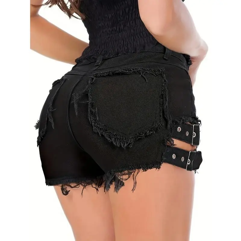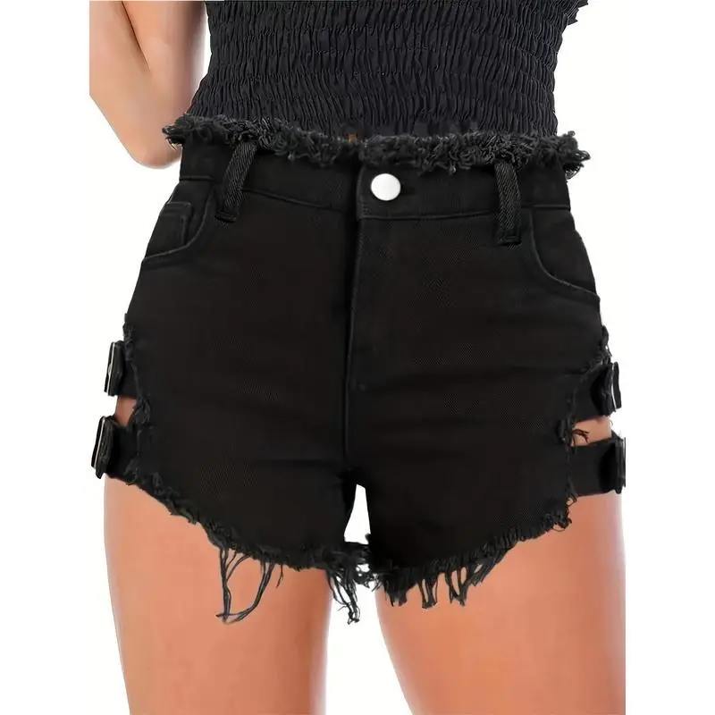 Women'SBlackDenimShortswithRawHem-HighStretch,FrayedHemDetail,RayonFabric,ElegantStyleforSpring/Fallplussizeclothing