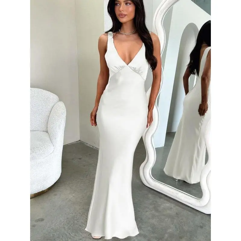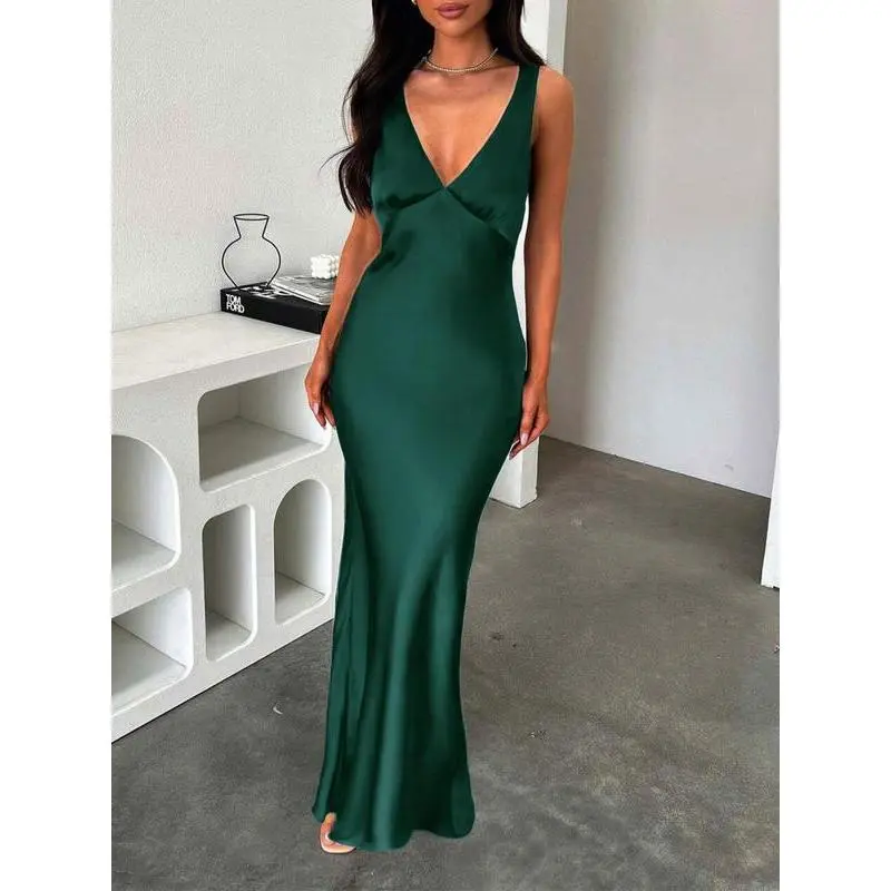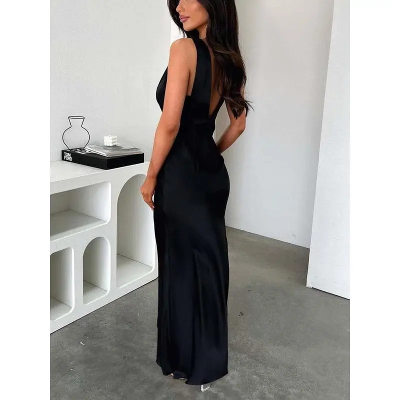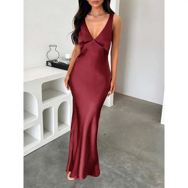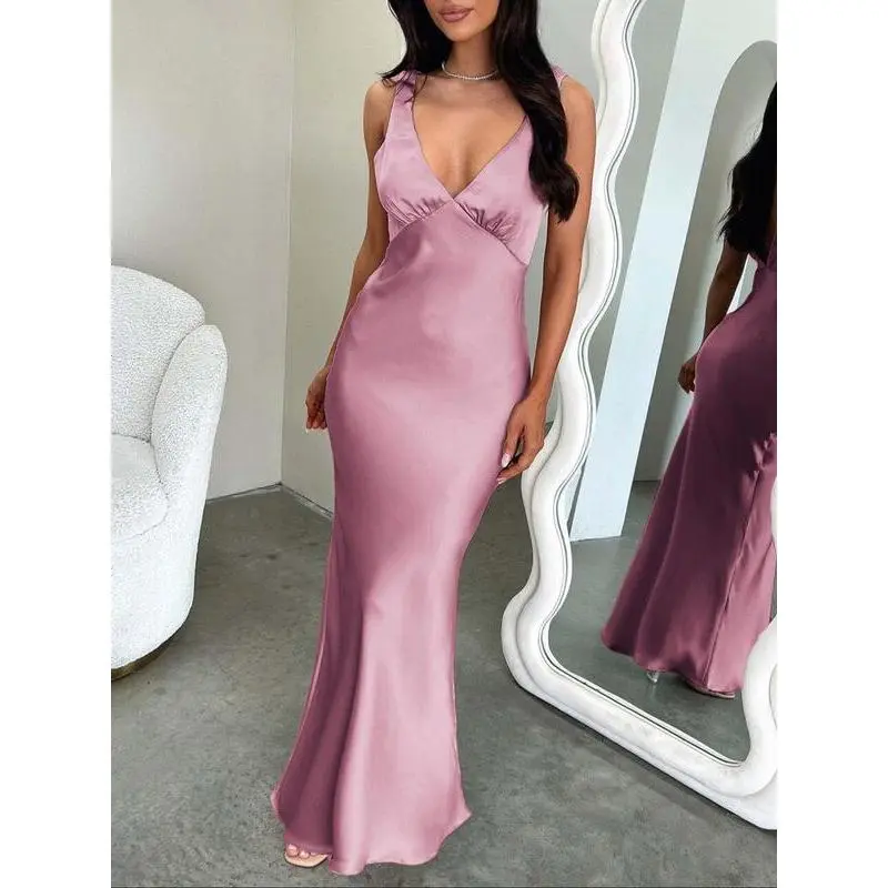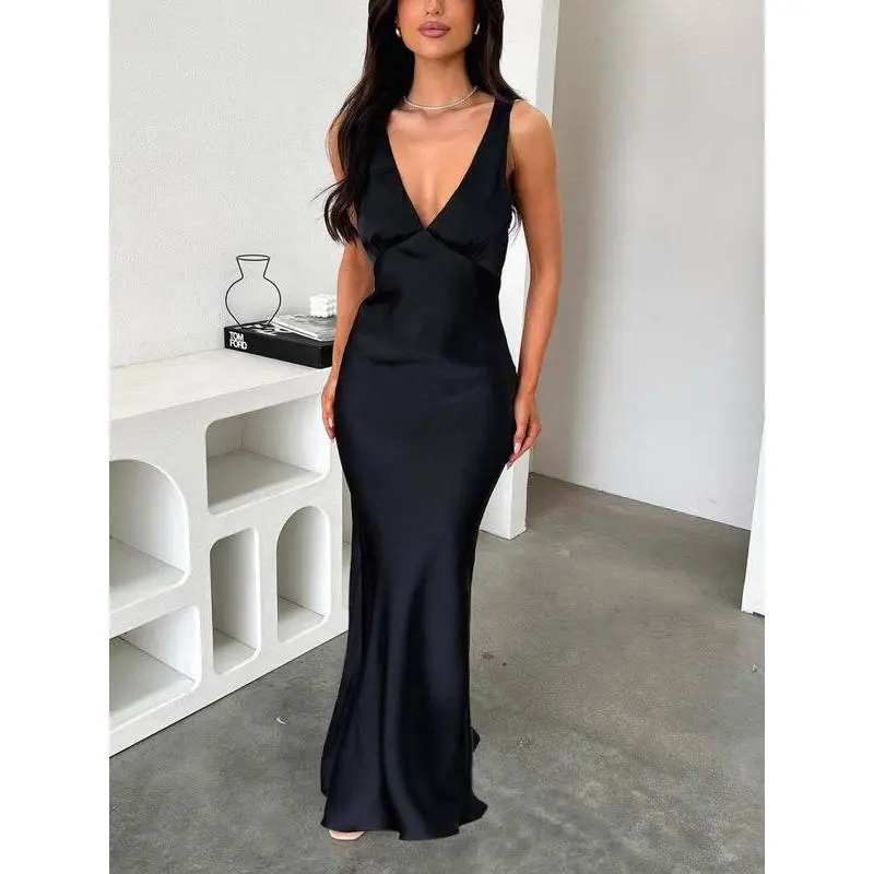??Floor-Length Elegance??: The gown's floor-length silhouette enhances sophistication, making it a striking choice for evening parties. ??Fitted Silhouette??: Designed to fit snugly, it accentuates your natural curves, ensuring a flattering and confident appearance. ??V Neckline??: The deep V neckline adds a touch of allure, making it chic yet refined for formal occasions. ??Sleeveless Design??: The sleeveless cut promotes breathability, allowing you to stay cool while looking effortlessly sophisticated.