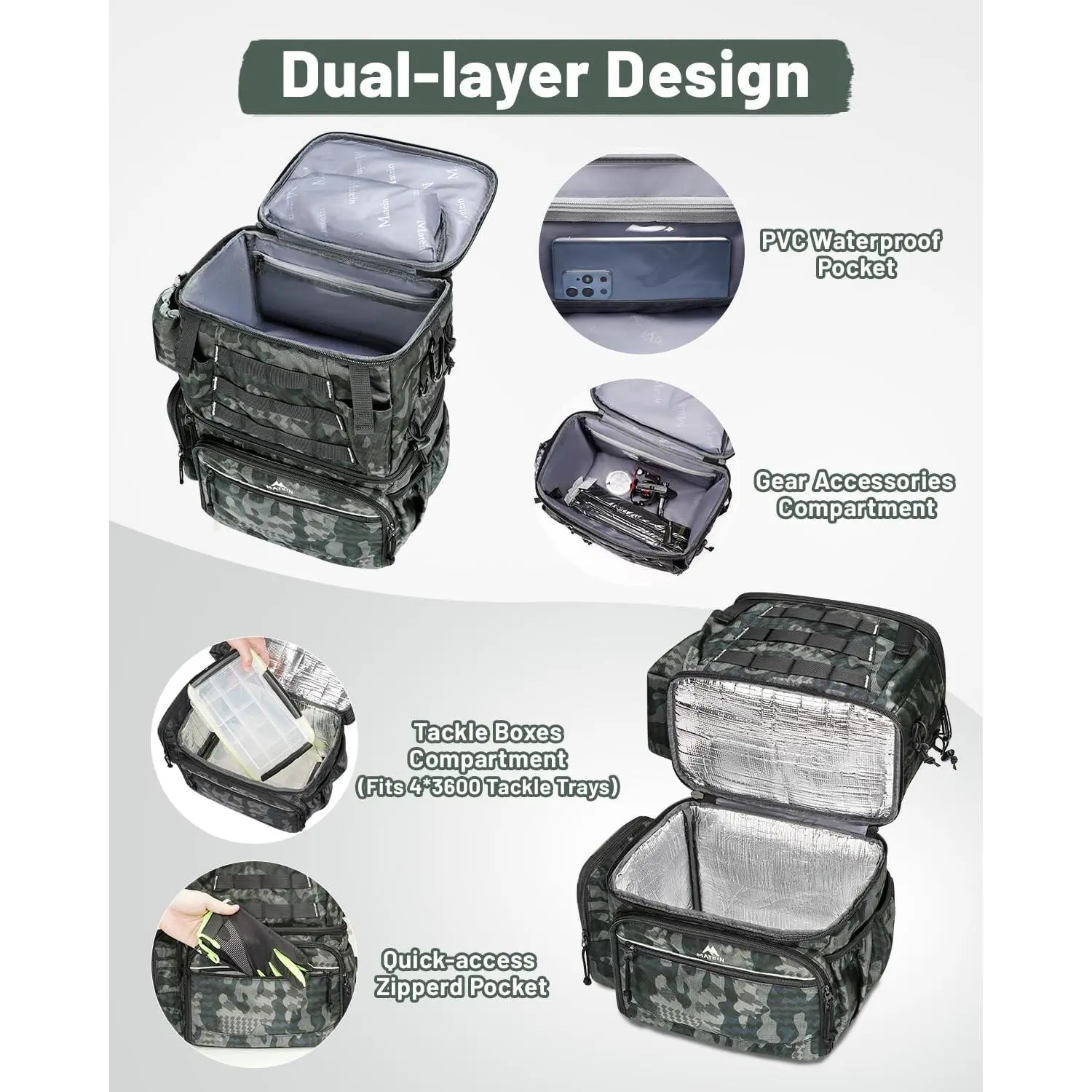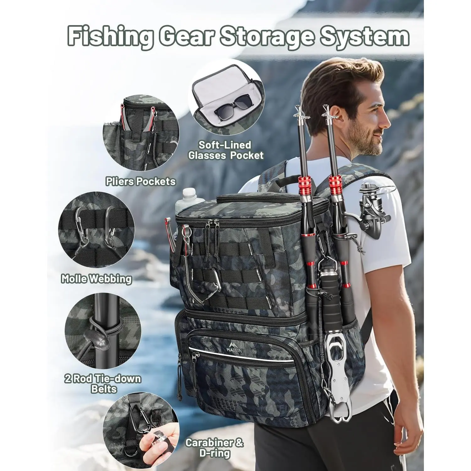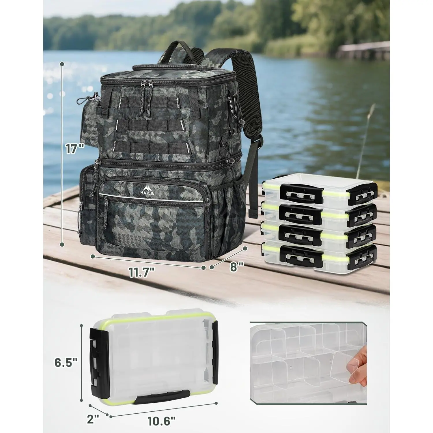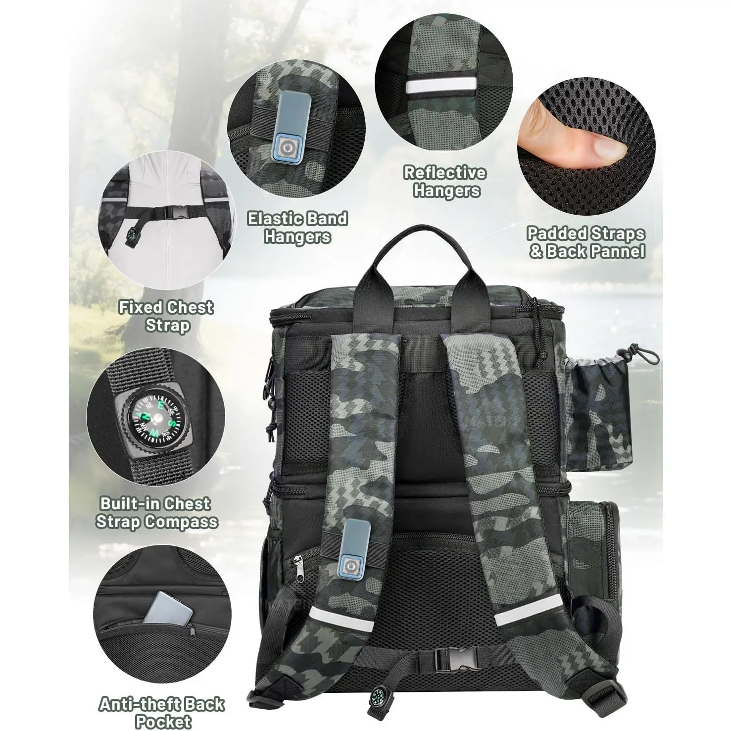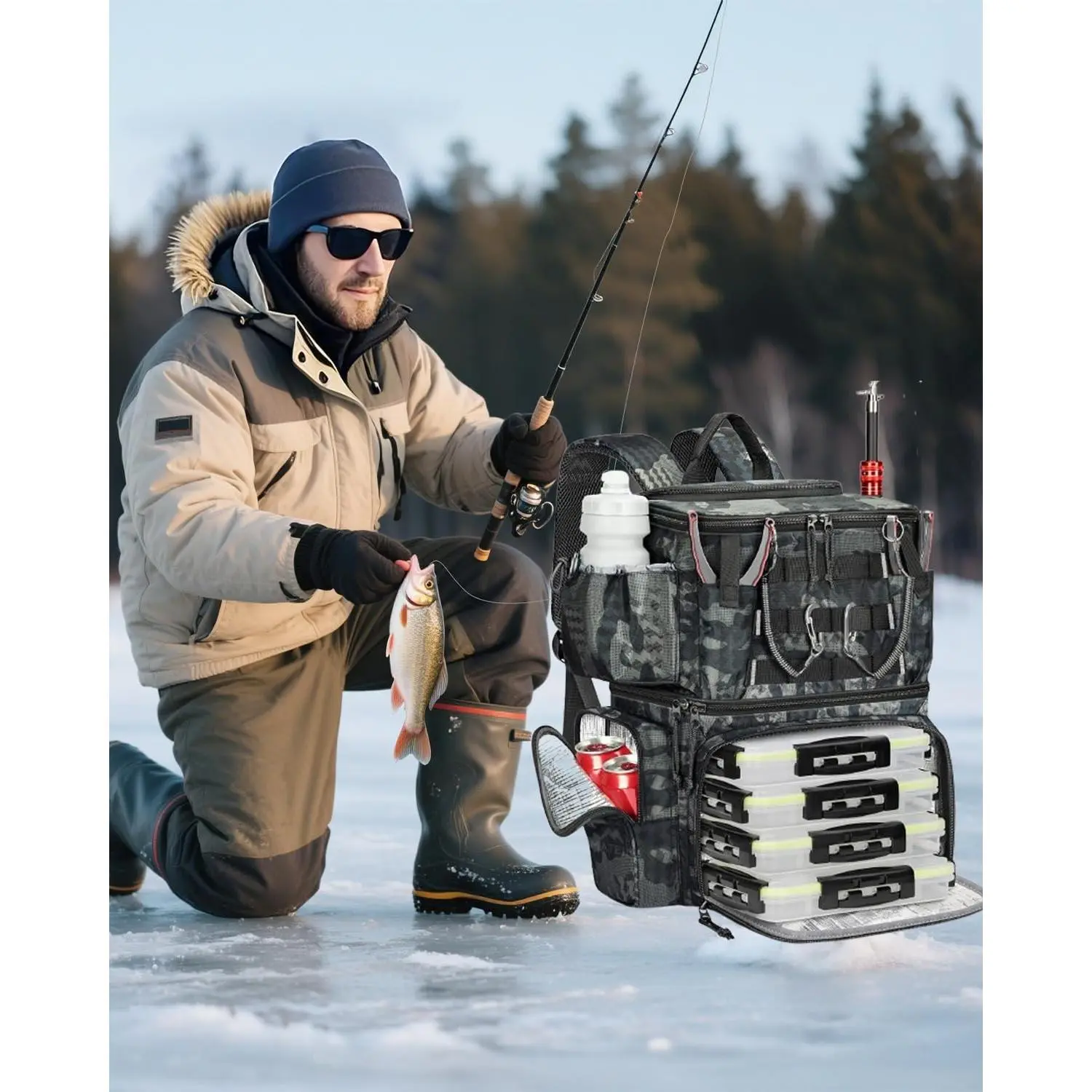 Fishing Backpack with 4 Tackle Boxes, Fishing Bag with Rod Holder & Safety Compass & Cooler, Gifts for Fishermen