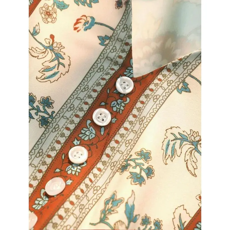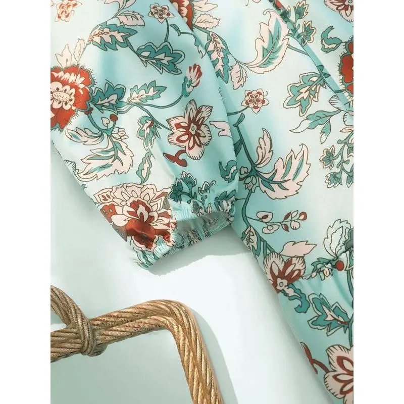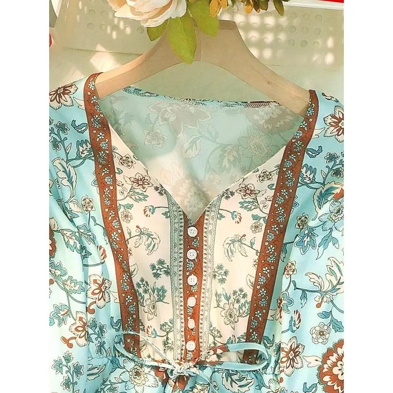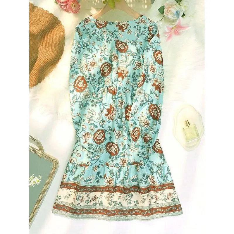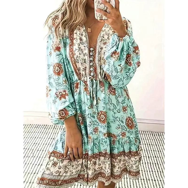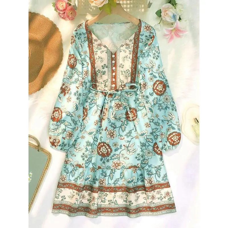 Women'sEthnicFloralPatternButtonFrontRuffleHemDress,BohoBishopSleeveTieFrontVNeckALineShortDressforBeachHolidayVacation,LadiesClothesforAllSeasons