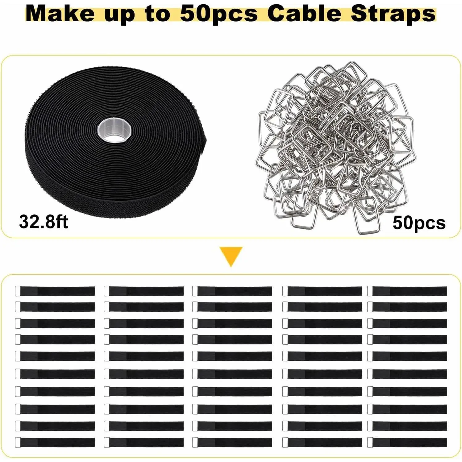 1"x32ft Hook and Loop Straps with 50 Metal Buckles, Adjustable Fastening Cable Straps, Cut-to-Length Cinch Strap, Reusable Nylon Securing Cord Ties for Organizer or Storage, 1 inch Wide, Black