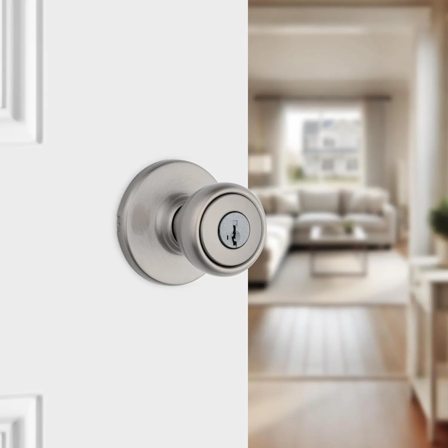 Entry Door Knob with Lock and Key, Secure Keyed Handle Exterior, Front Entrance and Bedroom, Satin Nickel, Pick Resistant SmartKey Rekey Security and Microban