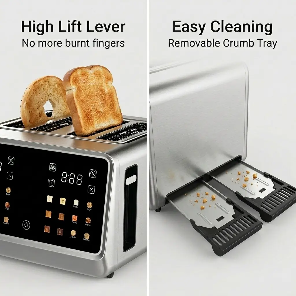 Dear Morning Digital Smart Toaster 4 Slice with Touchscreen Dual Control Panel Single Slot Timer Reheat Defrost for Bagels Bread Waffles Stainless Steel Kitchen Essentials