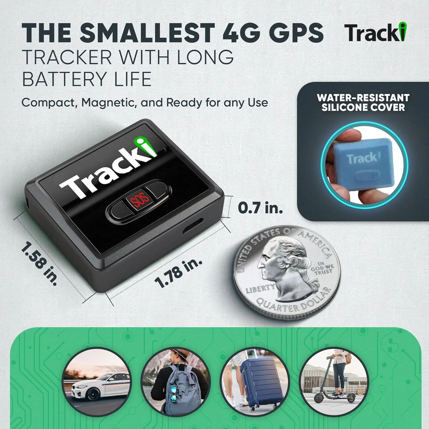 ·Compact & Hidden Design - Tracki is one of the smallest and lightest mini GPS trackers (1.8×1.6×0.7 in, 1.26 oz). Includes strong magnet, belt clip, lanyard & waterproof cover for hidden tracking devices for cars. Perfect car tracker device hidden for vehicles, trailers & luggage.