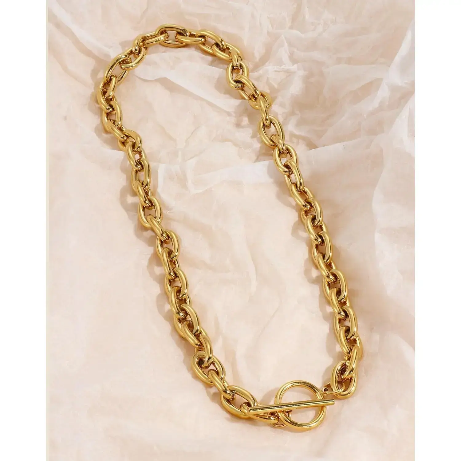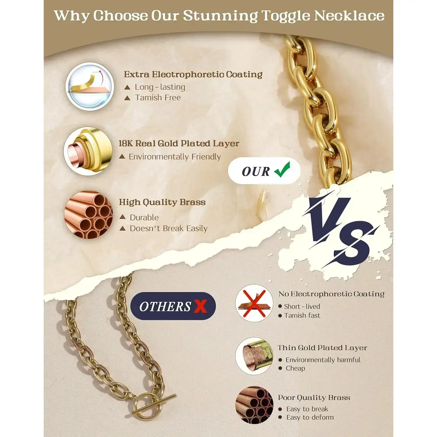 1. Non Tarnish Chunky Gold Necklace: Don't worry about having to toss this chunky toggle necklace after a few wears or staining your clothes or neck due to tarnishing. Our chunky link necklace set is crafted with the latest eco - friendly electrophoretic coating which forms a protective barrier against oxidation. Also, our gold link necklace are lead-free, nickel-free, hypoallergenic, waterproof, suitbable for all-day wear. 2. Special Notes: This toggle necklaces for women features 1 heavy and thick stainless steel chain link necklace(17.7''Length*9.2mm Width) , Weight:72g/2.54 oz. It is thicker and heavier than ordinary copper necklaces. In addition, due to the shooting light source and different displays, the actual product color may be more yellow and darker than in the picture. So, if you don't like real chunky heavy necklaces, please be cautious when placing your order. 3. Durable Chunky Gold Necklace: Crafted with robust stainless steel materials, our dainty 18k gold-plated plated cuban link chain necklace features sturdy thick gold paper clip chain designed to resist deformation and maintain their shape. Don't worry about breaking during transportation or after wearing our chunky gold statement necklace, they are very sturdy and durable.