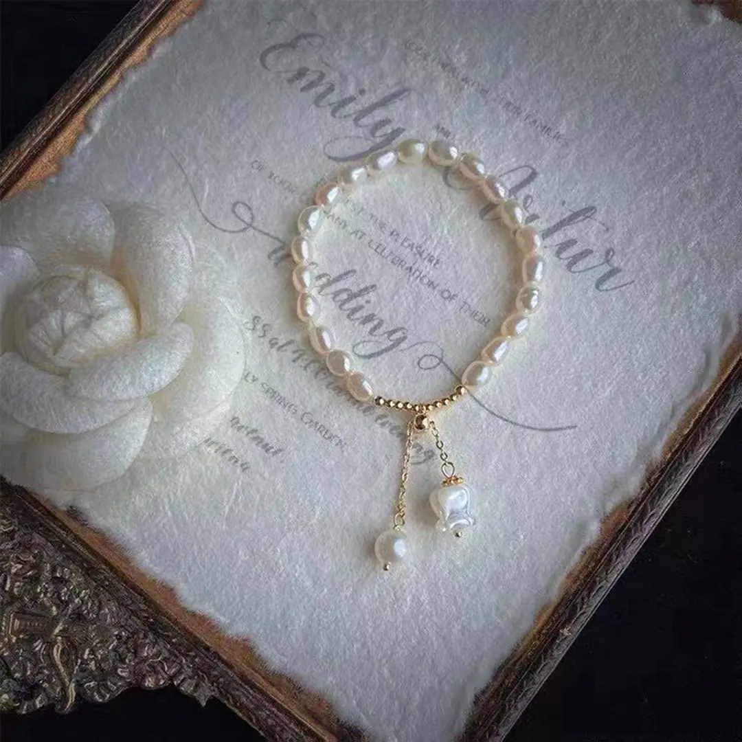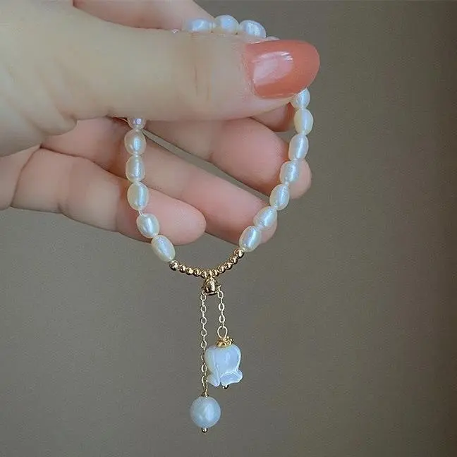 "The more elegant the more beautiful" Natural Sea Water Mother Shell Carving Bell Orchid Elastic Rope Bracelet Fashion Small Fresh Zhuji Freshwater Pearl Bracelet for Women MATERIAL: Natural Freshwater Pearl