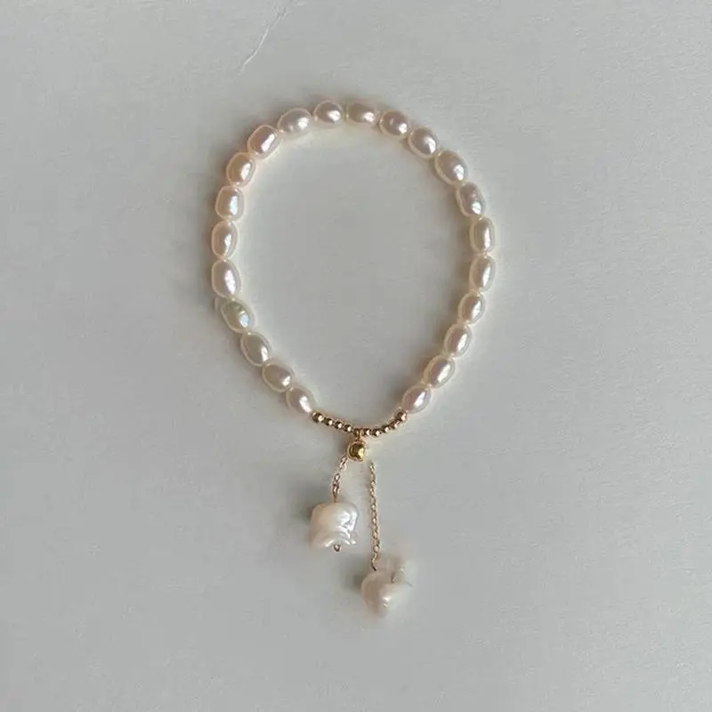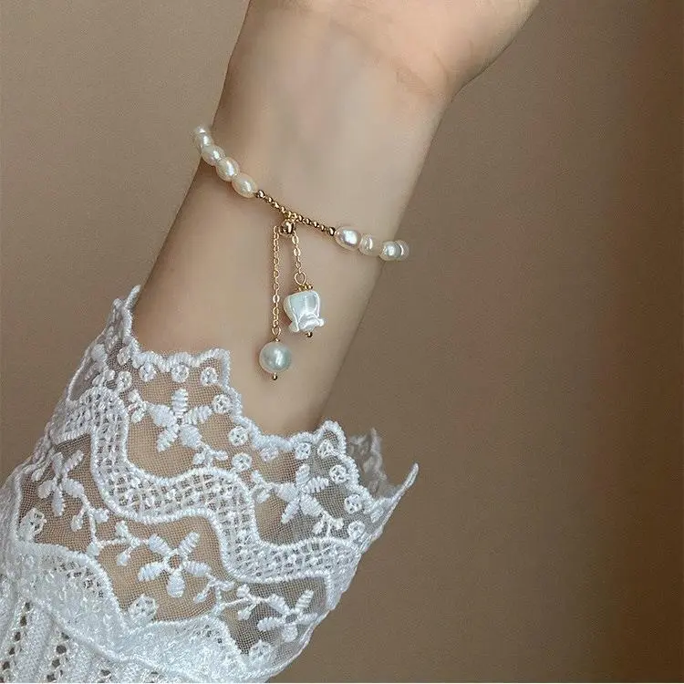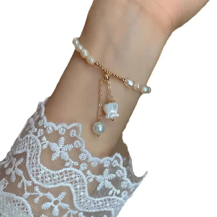 Natural Sea Water Mother Shell Carving Bell Orchid Elastic Rope Bracelet Fashion Small Fresh Zhuji Freshwater Pearl Bracelet for Women