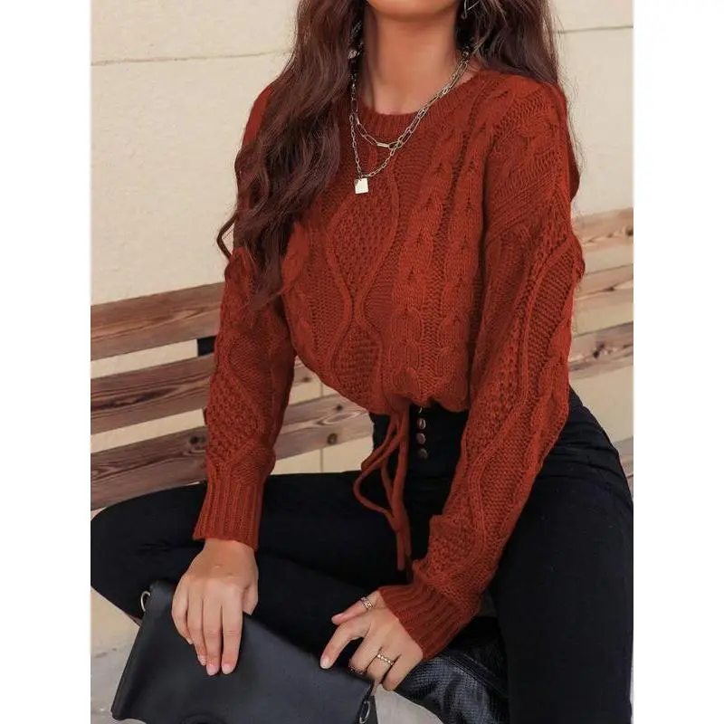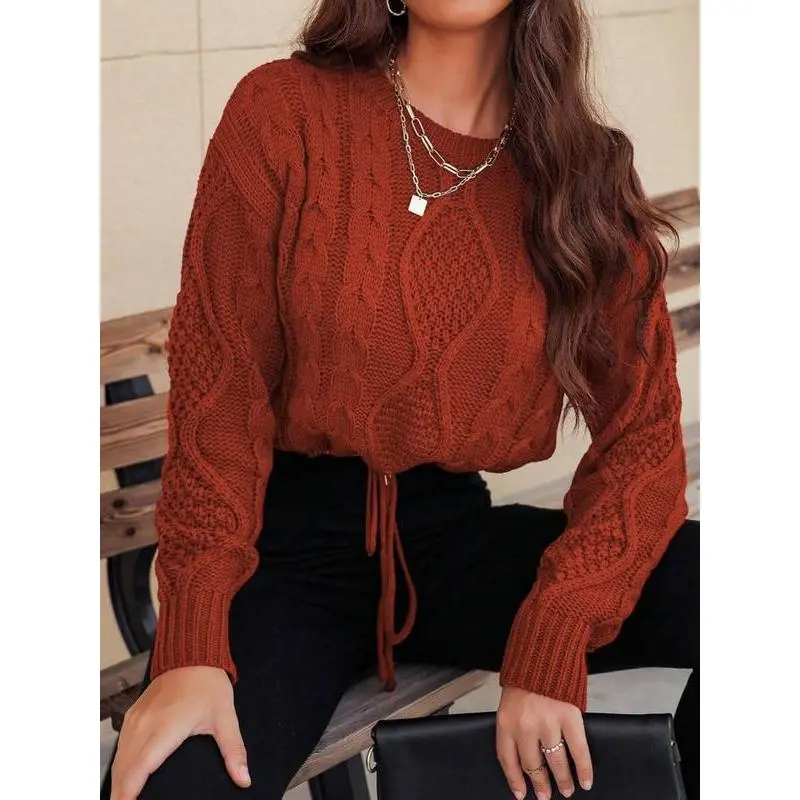 Women's Plain Drawstring Drop Shoulder Cable Knit Crop Sweater, Casual Fit Long Sleeve Round Neck Jumper for Fall & Winter, Sweaters for Women, Fashion Ladies' Knitwear for Daily Wear
