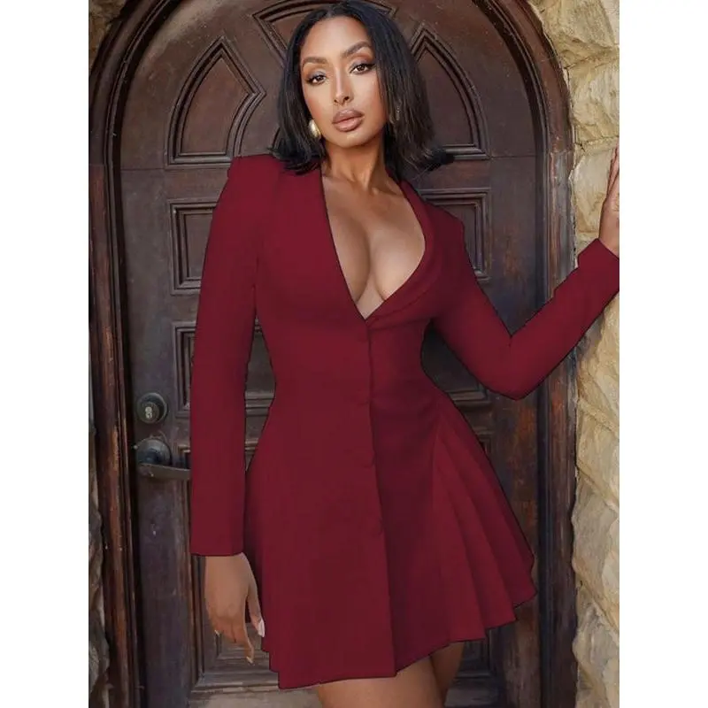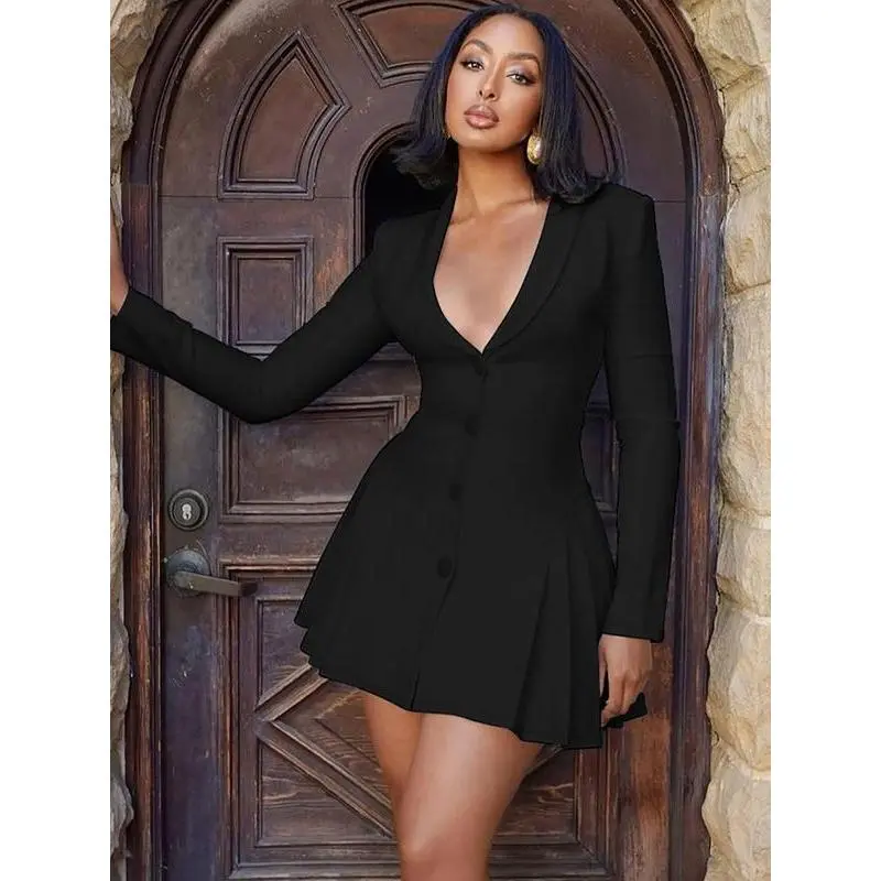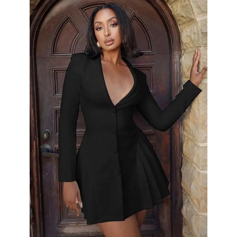 Women'sSolidButtonFrontPleatedSuitDress,CasualDeepVNeckDressforPartyClubDatingWear,DressSuit,FormalWear,PartyWear,Women'sDressforSpring&Fall,Women'sClothing,GoingOutDresses,Feminine