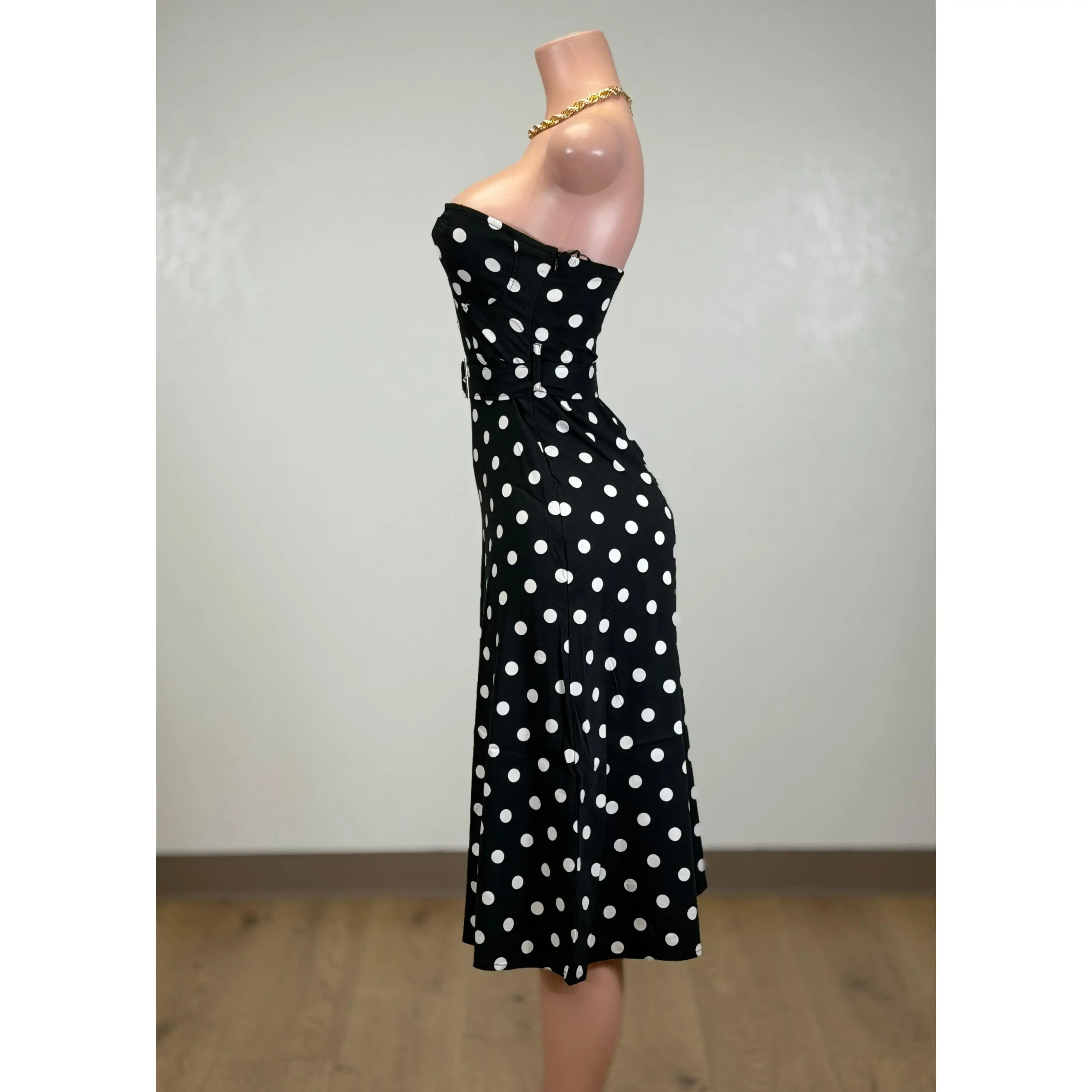 The MYLA BLACK POLKA DOT STRAPLESS MIDI DRESS combines timeless charm with modern elegance. This sleeveless stunner features a classic polka dot pattern and flattering strapless neckline, perfect for any occasion. The midi length and flowy silhouette create an effortlessly graceful look, while the included waist belt adds definition and versatility. A convenient side zipper ensures easy dressing, and the breathable rayon-blend fabric keeps you comfortable all day. True to size with a luxurious blend of rayon, nylon, and spandex for the perfect balance of movement and support.