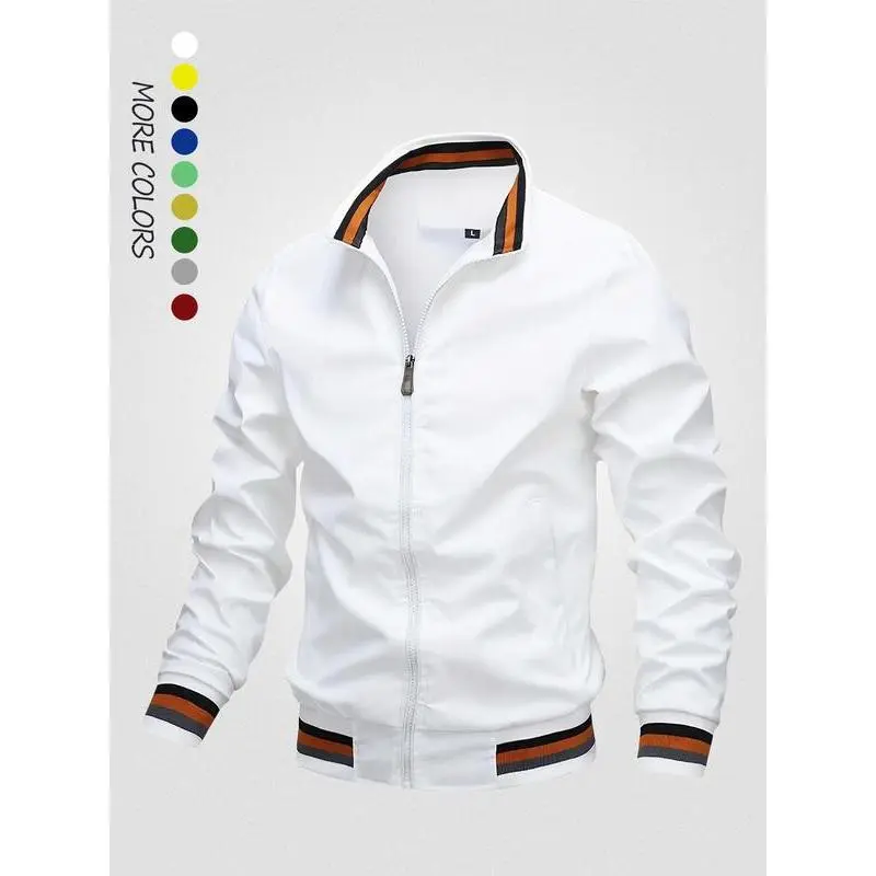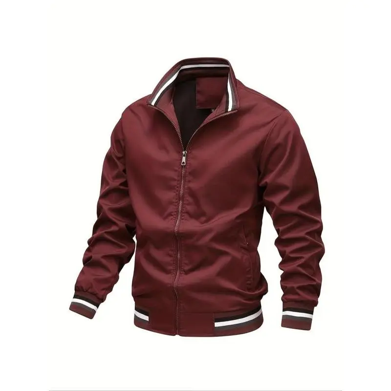 Men's Striped Trim Zip Up Varsity Jacket, Regular Fit Long Sleeve Pocket Baseball Jacket, Windbreaker Bomber Jacket, National Day Clothing,?Men's Spring Clothing