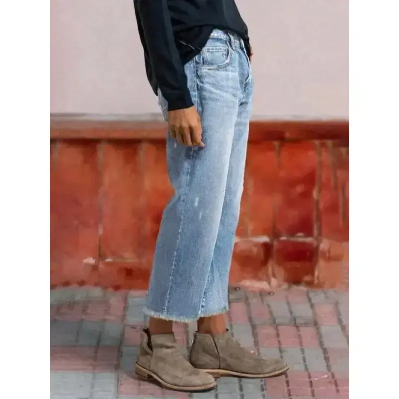 [Relaxed fit]: The loose-fitting cut allows for freedom of movement during everyday activities and outings. [Distressed details]: Featuring a washed and frayed edge look, these jeans offer a contemporary casual vibe that stands out. [Seasonal versatility]: Designed for all seasons, these denim shorts are adaptable for any weather, ensuring wearability year-round. [Moderate fabric thickness]: Crafted from medium-weight denim, these pants provide durability without sacrificing breathability for year-round use. [Straight leg cut]: The straight leg design delivers a classic silhouette, making them suitable for various occasions and outfits.