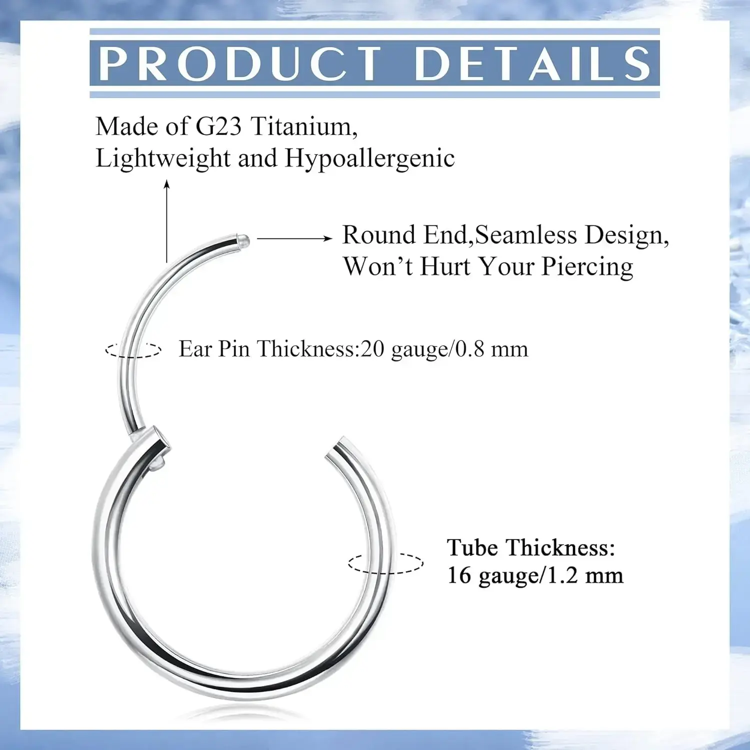Our titanium earrings are 100% genuine G23 titanium, Beware of products that use stainless steel to pass themselves off as titanium. 【G23 Titanium Hoop Earring】 Titanium is the perfect jewelry material. Titanium itself is characterized by its high hardness, Light weight, Hypoallergenic properties, And will not rust even if you put it in sea water. Especially suitable for sensitive ears. These premium titanium earrings are made from G23 implant grade titanium, Not titanium steel. MILACOLATO JEWELRY creates the perfect jewelry gift to expand a woman's stylish wardrobe with a modern twist. 【Buckle for Hoop Earrings】 Round head buckle, seamless design, does not hurt the perforation, Easy to open and close the buckle by hand, No tools required, Milacolato Hoop Earrings use the latest production process to strictly control the quality, The hinge part pulls open and snaps, easy to insert the perforation, Don't worry about losing while bathing, walking or exercising. 【Styles and Sizes】 A pair of earrings are included. Perforation needle thickness: 0.8mm/20G, inner diameter: 8mm, 10mm, 12mm, three sizes are available. Four Colors are available in four different colors, you need to measure your piercing to confirm the size before buying, choose the size that suits you. If you have any questions about the size, please contact us. These hoop earrings are effortless, stylish and simple for everyday wear. 【 Why Choose Us】 These hoop earrings are made from healthy G23 metal titanium and have a slightly darker finish than steel. Highly polished, smooth surface, comfortable without sharp edges, prevents skin irritation; hypoallergenic, will not cause any allergic reactions. The stability of titanium provides long-lasting color retention and extremely easy cleaning. 【 Why Choose Us】 These hoop earrings are made from healthy G23 metal titanium and have a slightly darker finish than steel. Highly polished, smooth surface, comfortable without sharp edges, prevents skin irritation; hypoallergenic, will not cause any allergic reactions. The stability of titanium provides long-lasting color retention and extremely easy cleaning. 【Service Guarantee】 If the Milacolato Titanium Hoop Earrings are defective, we will reissue them for you. If you have any problem with G23 Titanium Hoop Earrings, Please feel free to contact us, We will solve your problem as soon as possible. Cute and Dainty Small Hoop Earrings Why Choose Us Made of high-quality G23 titanium, Gentle and non-irritating to your sensitive ears. Round Head Buckle Round End, Seamless Design, Won’t Hurt Your Piercing. Ultralight and elegant titanium hoop earrings for unprecedented all-day comfort. Material: G23 Titanium The column size is 20G/0.8MM (the part that goes through the ear hole) We offer 8mm 10mm 12mm inner diameter Titanium hoop earrings can easily complement your look while showing off your style. It is an everyday must-have for men and women. Pairs perfectly with all your formal and casual attire. From the brand