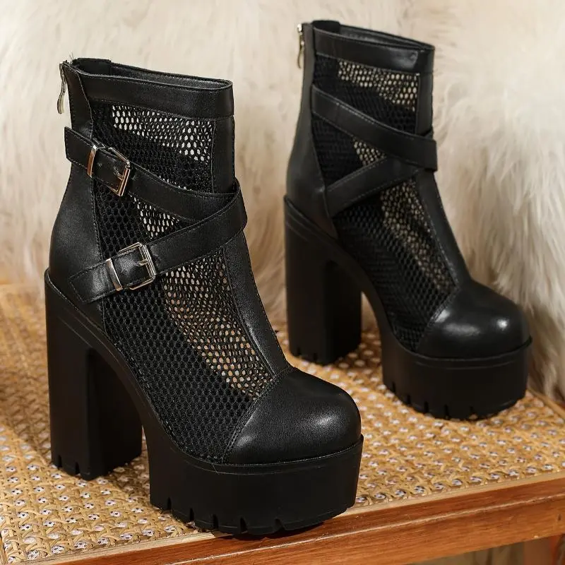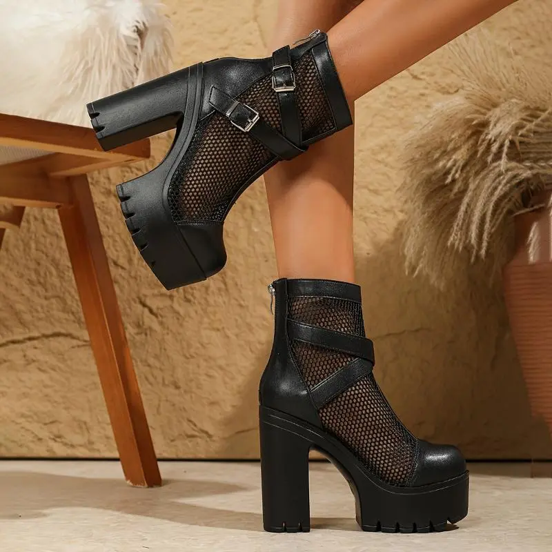 Women'sAnkleBooties,MeshCutoutPlatformBoots,CrisscrossBuckleDetailChunkyHeelFashionFootwearGirlShoeWalkingShoesComfortLeatherInsoleKnee