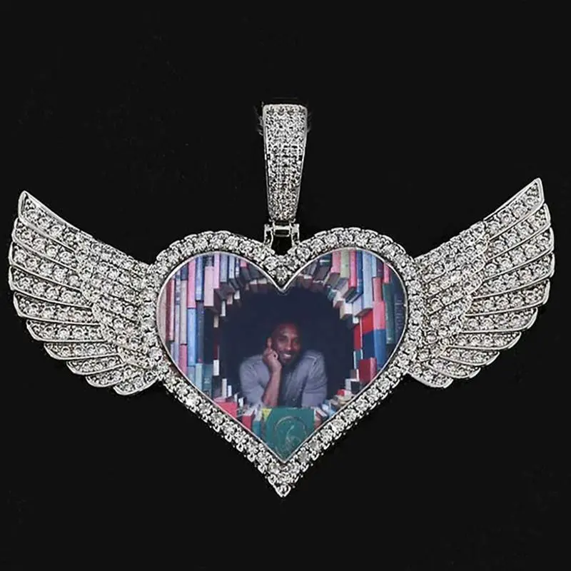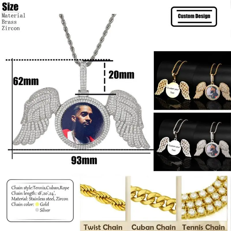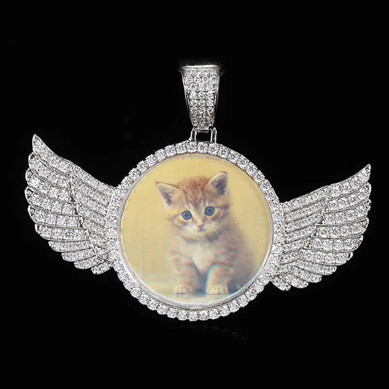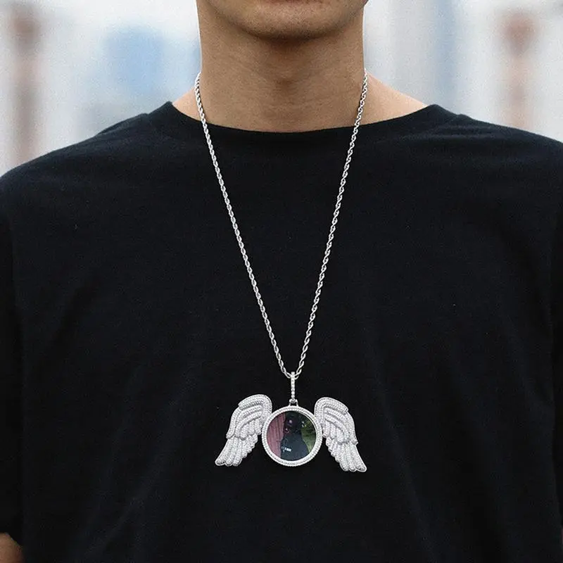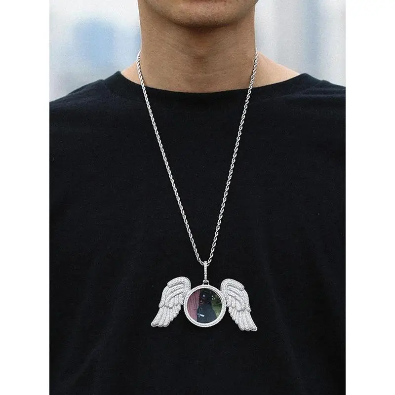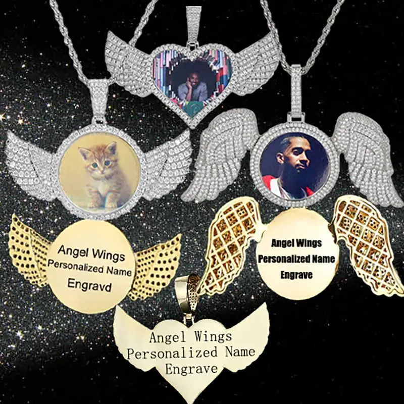 Angel Wings Medallions Custom Photo Pendant Necklace Iced Out Pendant Engraved Name Memory Gift Men(Please send a DIY picture to customer service)
