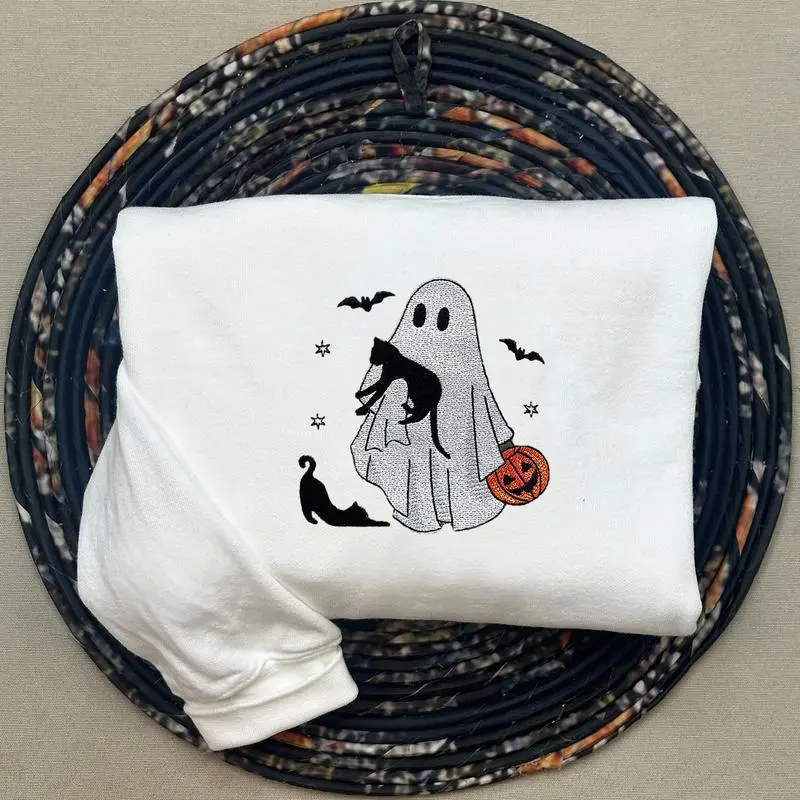 Embroidered Halloween Ghost with cats Sweatshirt
