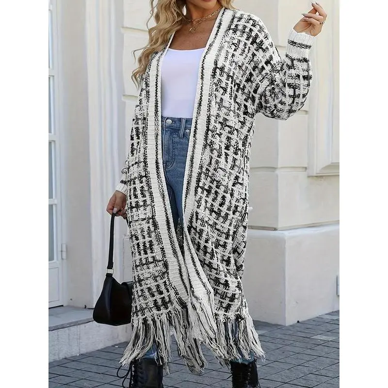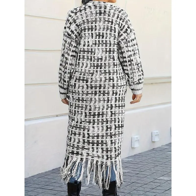 PlusSizePlaidPrintFringeTrimLongCardigan,CasualLongSleeveOpenFrontKnitwearforDailyWear,Women'sKnitClothingforAllSeasons