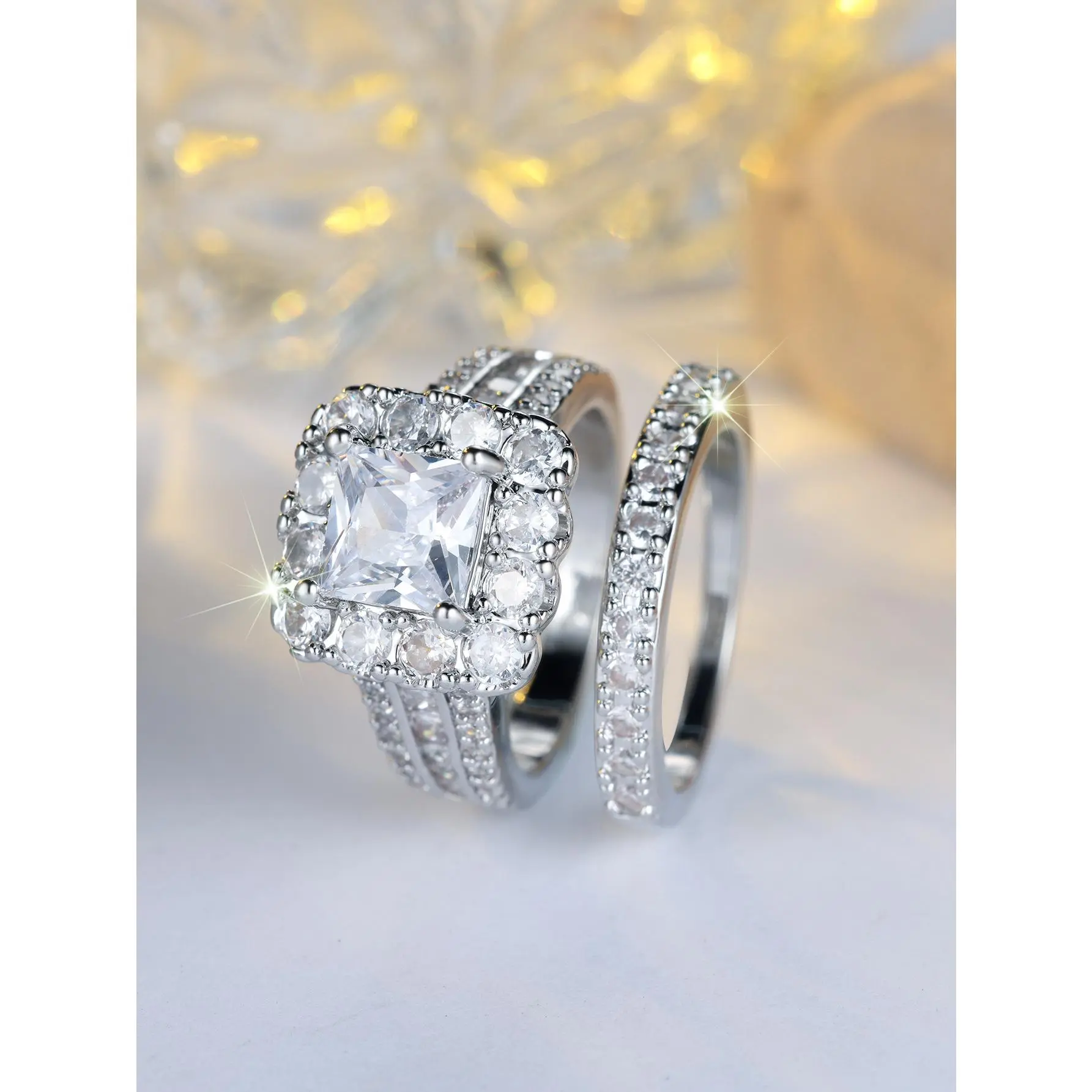 2Pcs 925 Silver Wedding Rings Set for Women Halo Princess Cut White Cubic Zircon Vintage Luxury Jewelry Engagement Ring #Love Story#Love Story #Love Story
