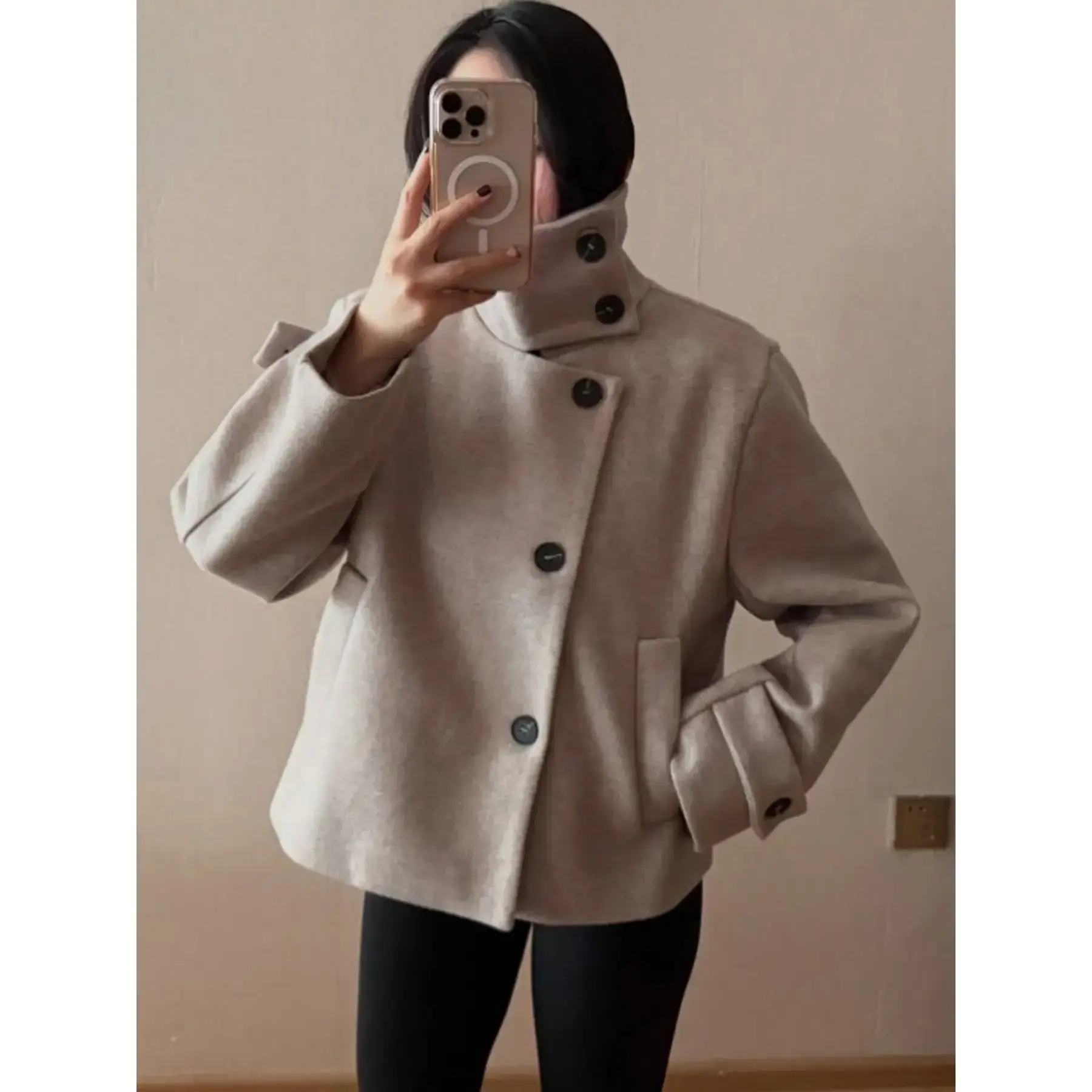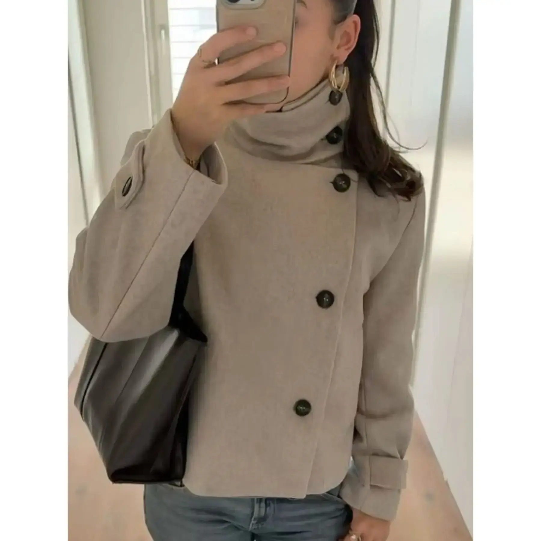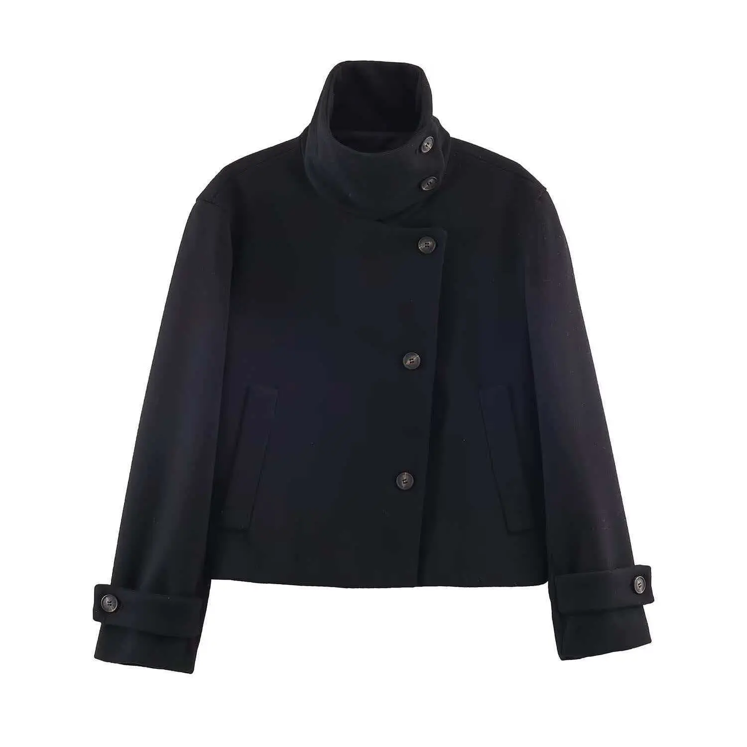 Female Tweed Jacket Outerwears Women's Casual Cropped Faux Wool Coat Spring Button Long Sleeve New In Jackets Street High Neck Short Coat Demi-Season Female Outerwear