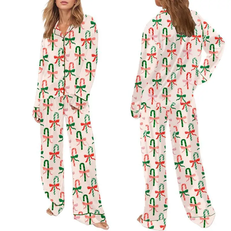 WomenChristmasPajamasSet2PiecesLoungewearSuitsBow/Santa/TreePrintLongSleeveShirtsTopsandPantsSleepwearOutfitsWomenswearCheckLightPjsTrouserPyjamas