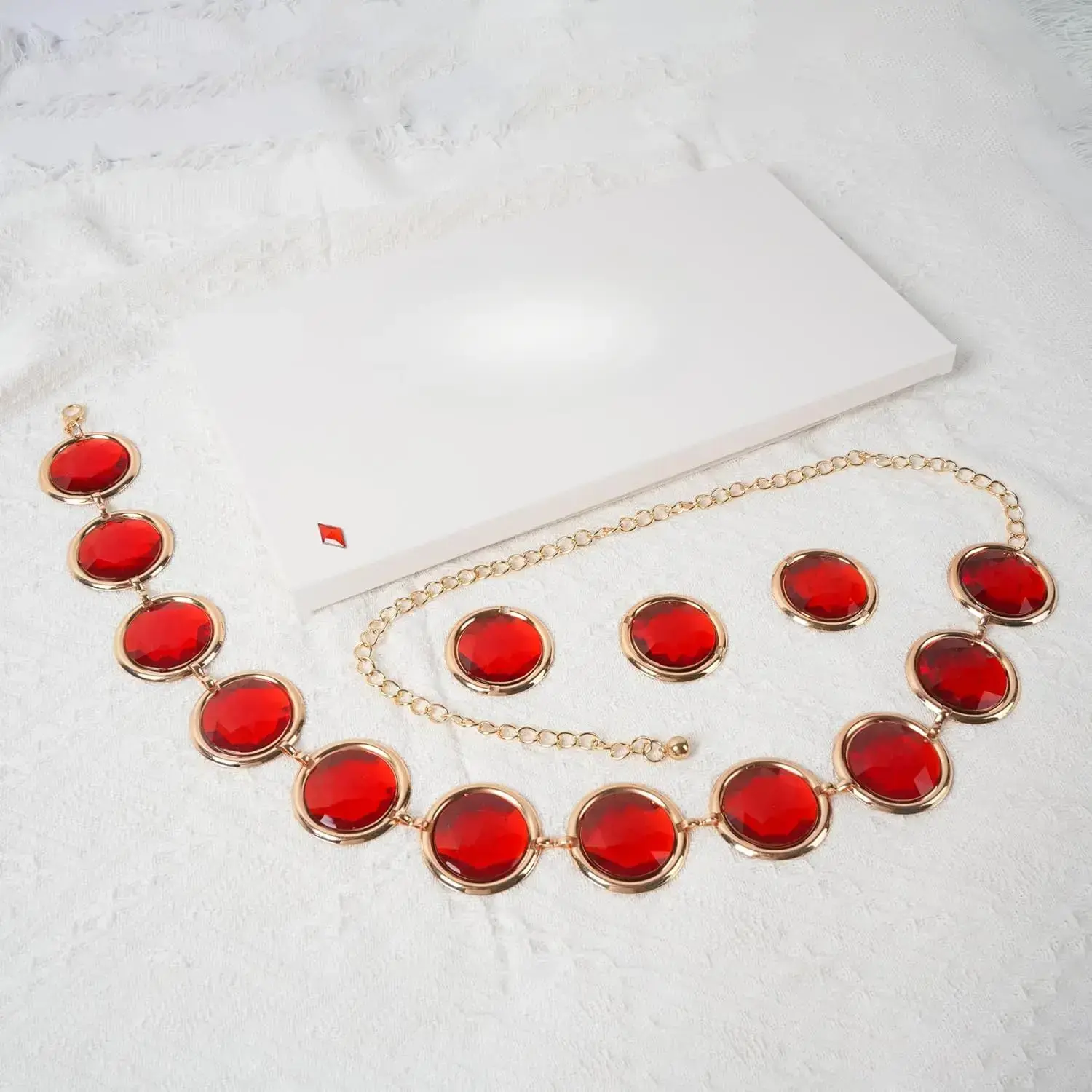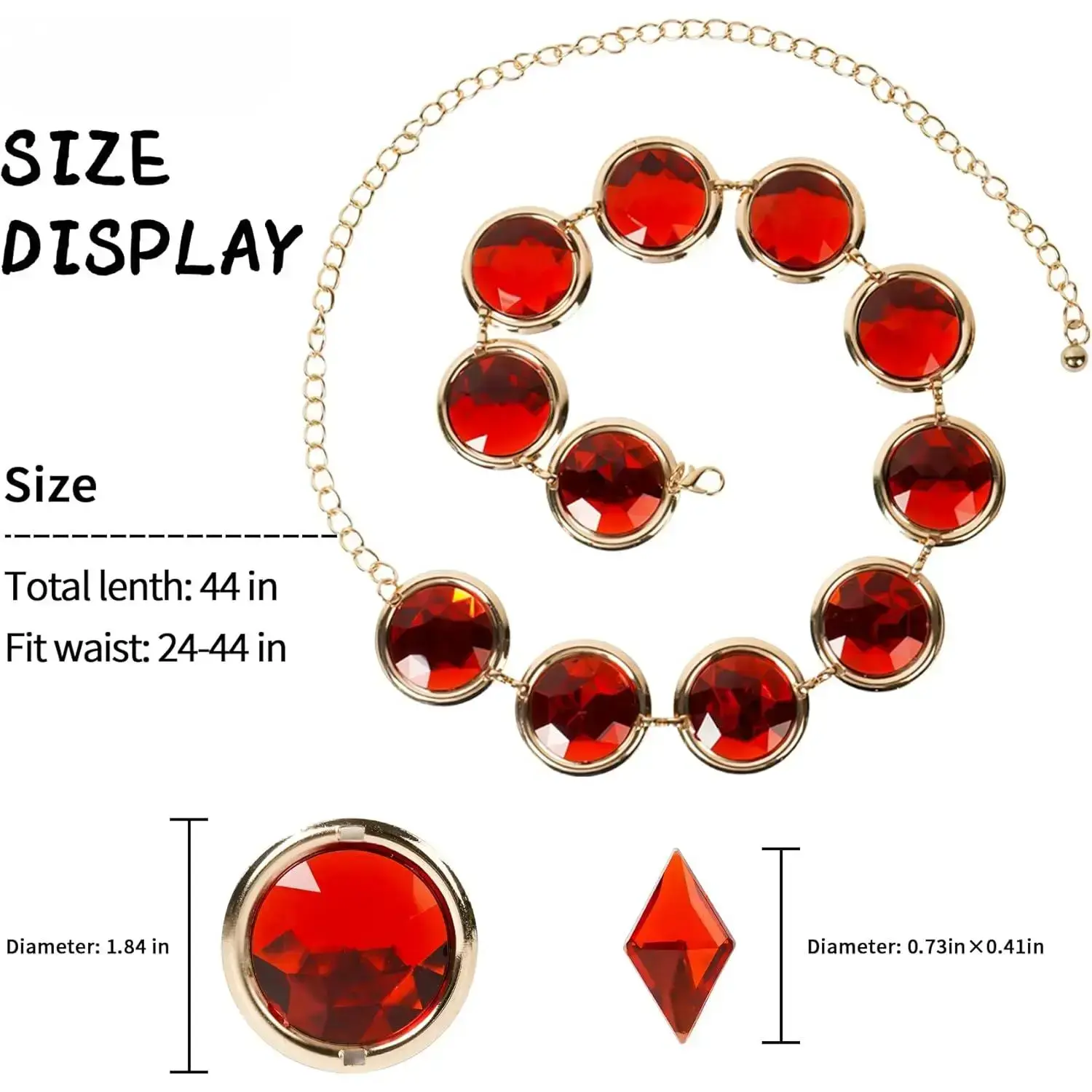 [Anime Cosplay Stone Chain Belt Set] Come with 1 waist belt chain (11 red round acrylic rhinestones), 3 red round acrylic rhinestones, 1 red diamond acrylic rhinestones. (Note: the rhombus rhinestones are not adhesive, please prepare extra glue to stick them by yourself.) [High-Quality materials]The red rhinestone chain is made of high-quality alloy chain and red acrylic rhinestone that is designed to last, shining and attractive and not easy fade, so you can enjoy its beauty for years to come. (Tips: Please handle with care to maintain the longevity of the product. Avoid contact with heat and chemical cleaners.) [Product Dimensions & Ease to Use]The women's anime cosplay belt stone chain is about 24 inches long, plus a 20 inches extension chain, suitable for waist circumference 24 to 44in, the red round stone is about 1.7 inches in diameter. The red diamond stone is about 0.71 * 0.43in. And the lobster clasp on the adjustable gem belt chain allows you to easily adjust it to your waist size for a better fit. [Wide Application]The minimalist yet stylish design of our crystal chain waist belt makes it suitable for a variety of occasions - for Halloween Cosplay, Daily, Anime Festival, Themed Costume Party, Masquerade, Carnival, Christmas, Easter, New Year's Eve Party, etc. This stylish and unique anime cosplay belt makes a perfect gift for those who love to stand out from the crowd. [Our Service] We are committed to providing our customers with high-quality, stylish accessories that add a touch of elegance to any outfit. If you have any questions about the red gem waist belt, please contact us immediately, we will help you solve them according to your expectations. We are committed to providing each customer with the highest standard of customer service.