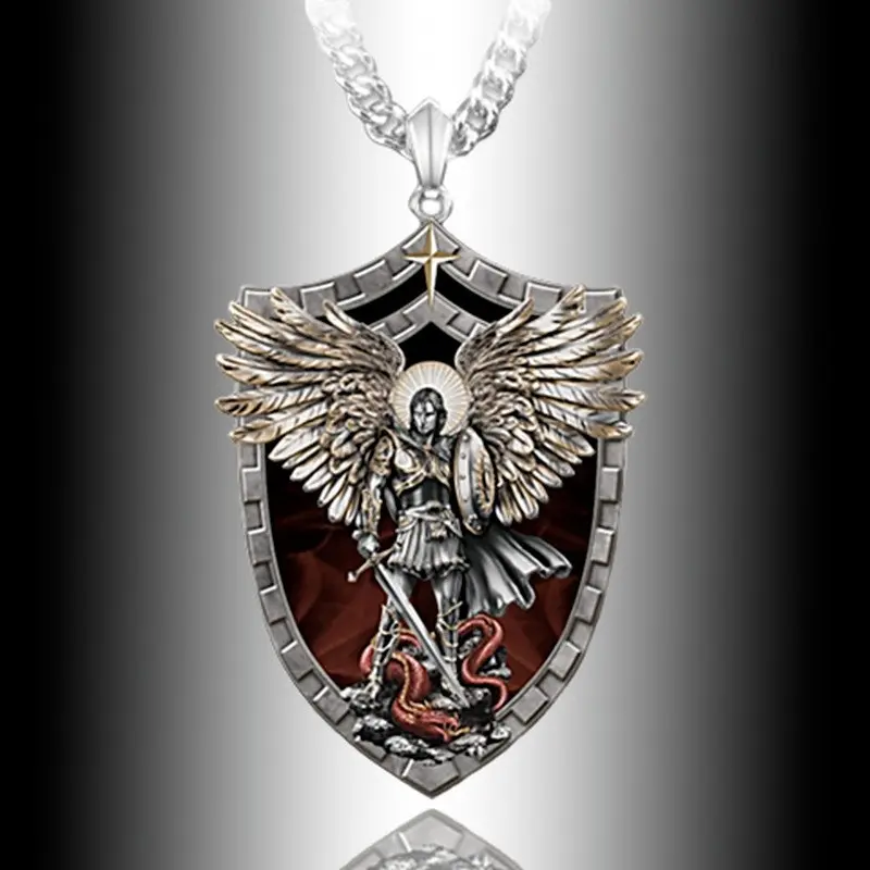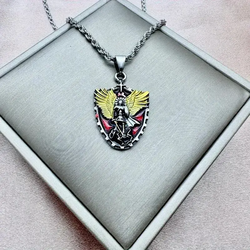 Men's Stainless Steel Necklace Warrior Guardian Angel Saint Michael Pendant Necklace Men's Knight Shield Necklace Jewelry Gift