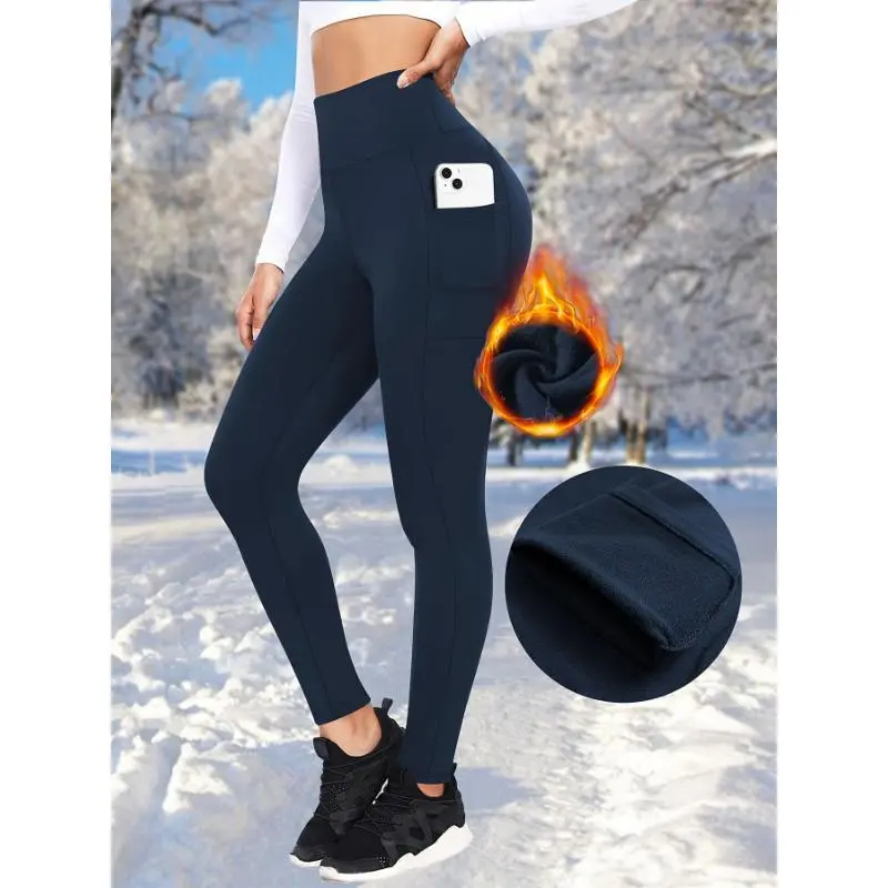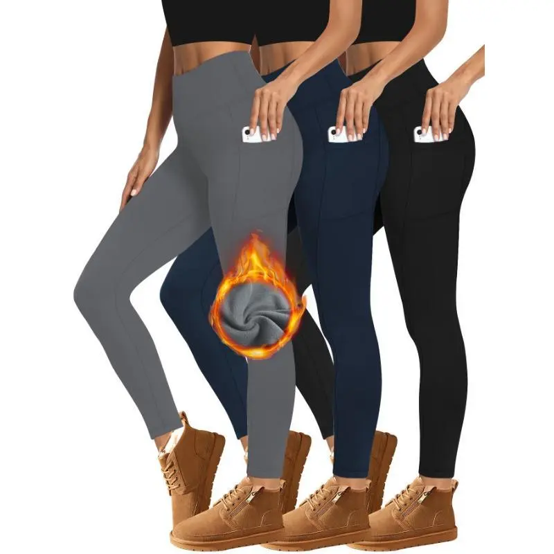 3 Pieces Of Fall And Winter Brushed Fleece Lined Leggings With Pockets, Women's High Waisted Outerwear Sport Fleece Yoga Pants For Warmth In Fall And Winter. Slimming High-waisted Yoga Pants, Sports Running Tights.
