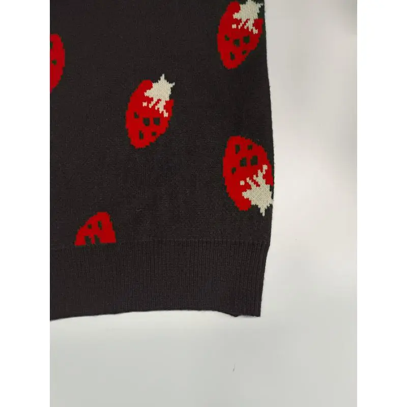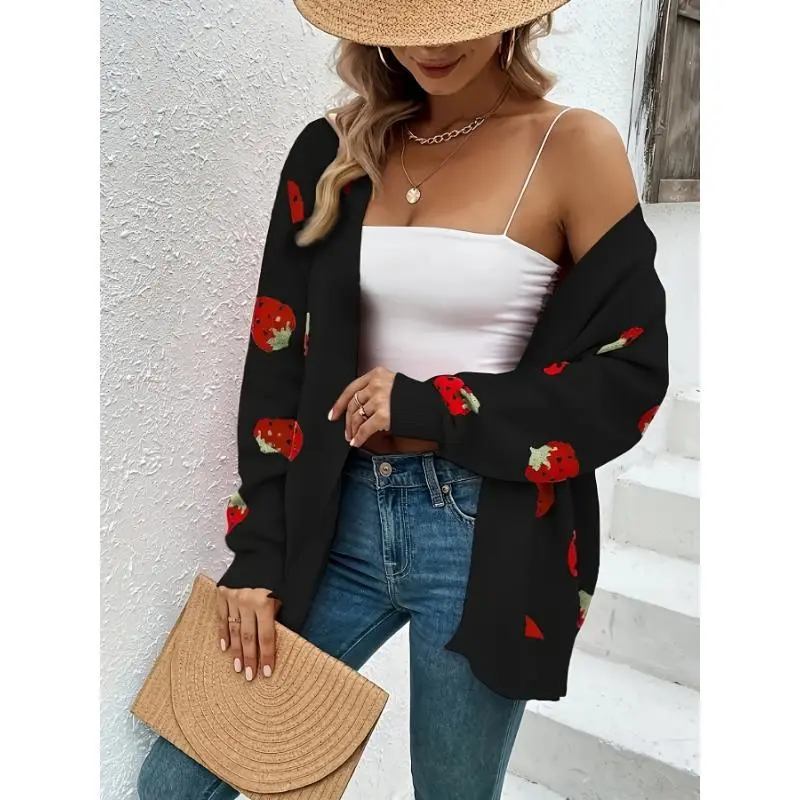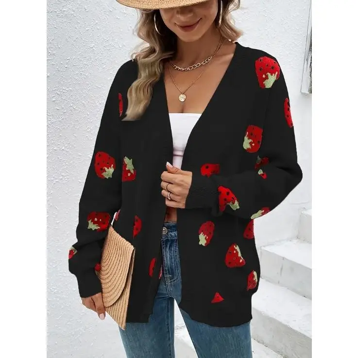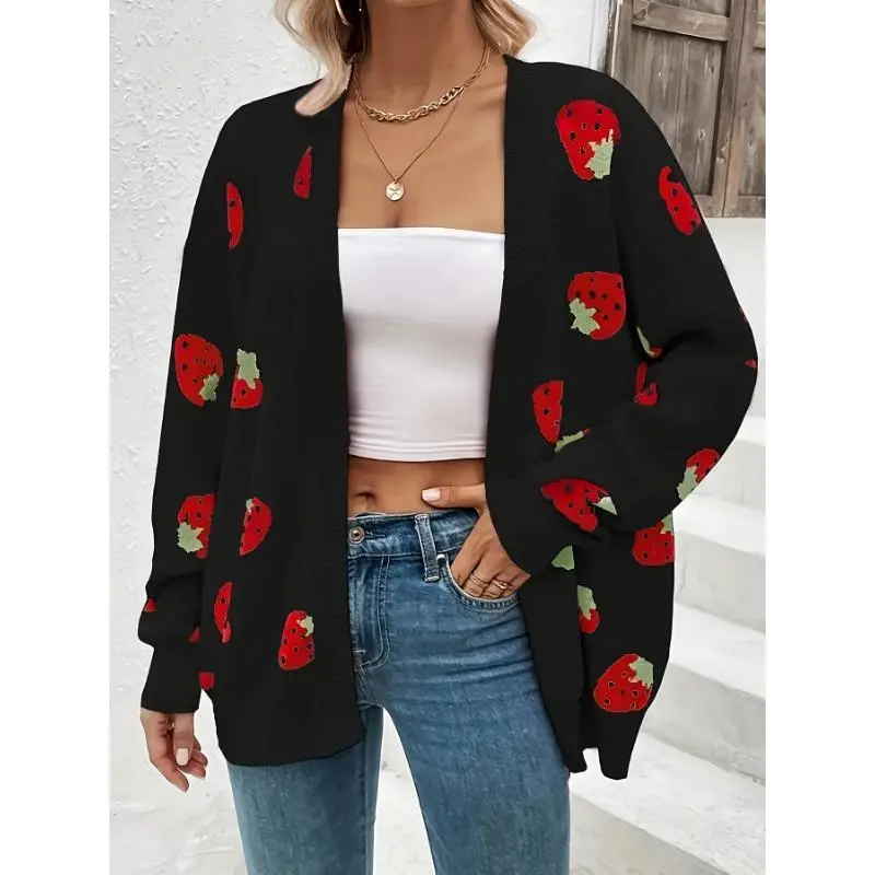 [StrawberryPatternCardigan]PlusSizeWomen'sStrawberryPatternCardigan-CasualLongSleeve,OpenFront,BlackKnitOuterwearforFall/Winter