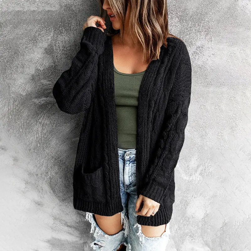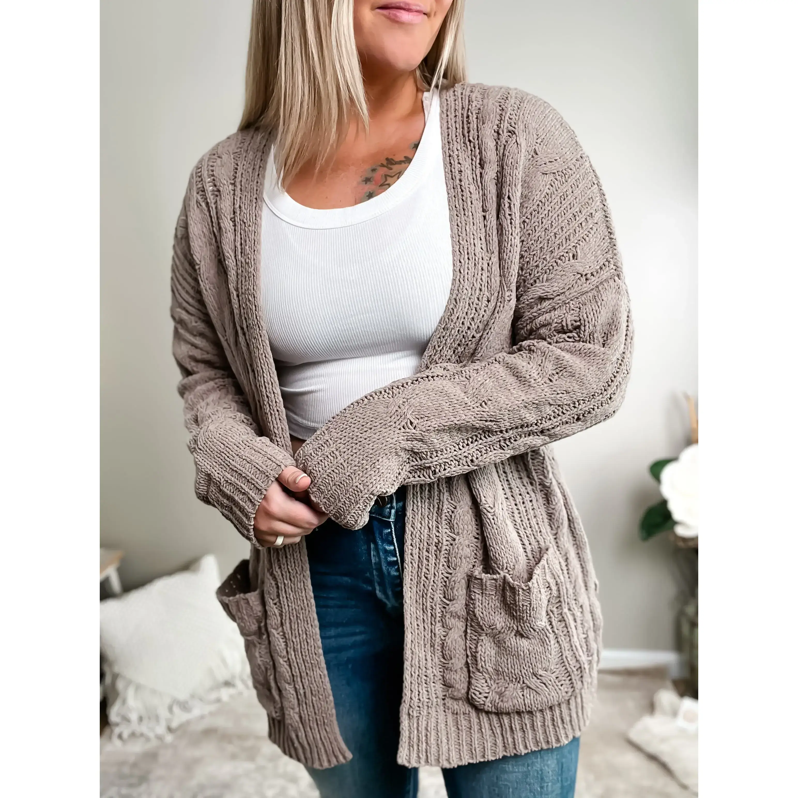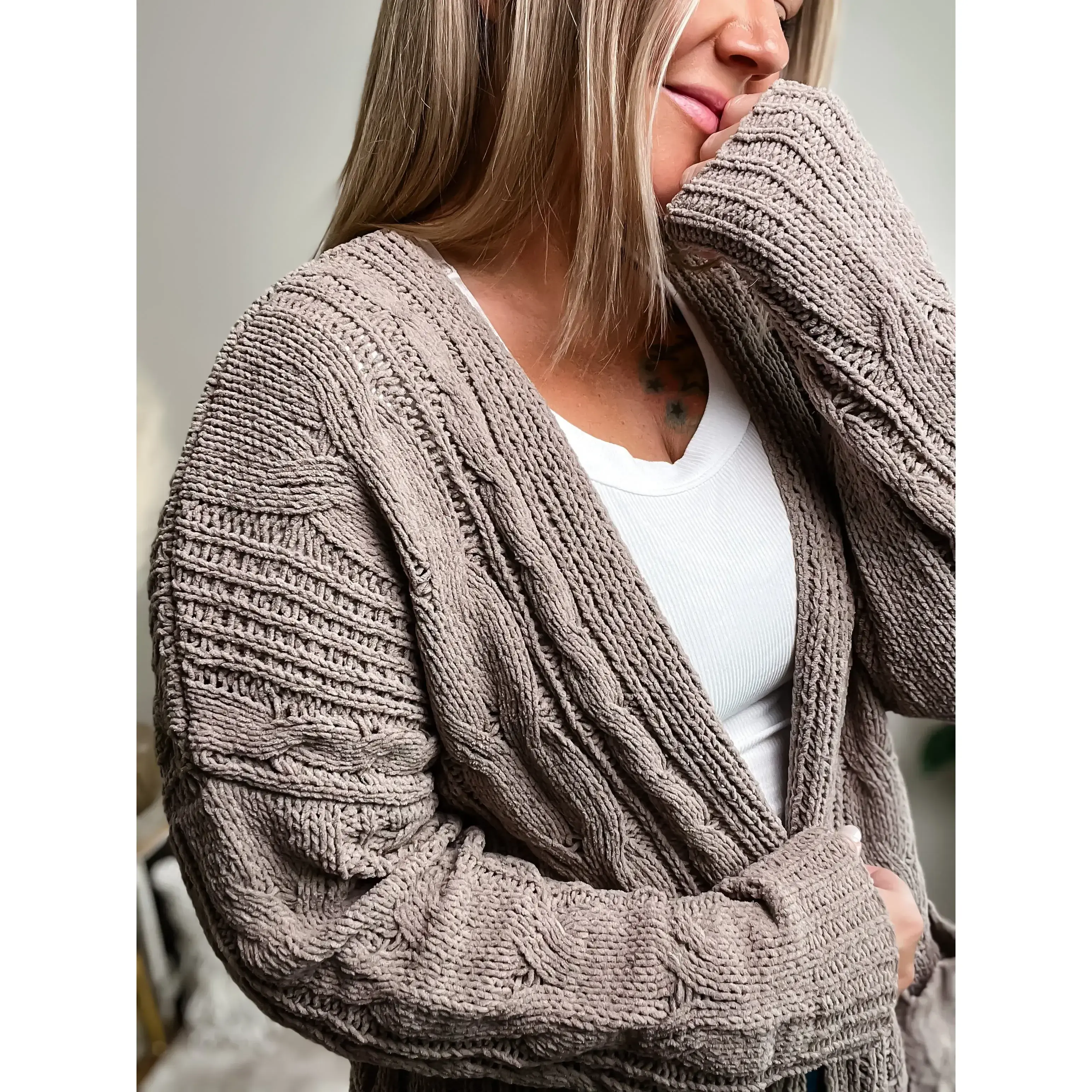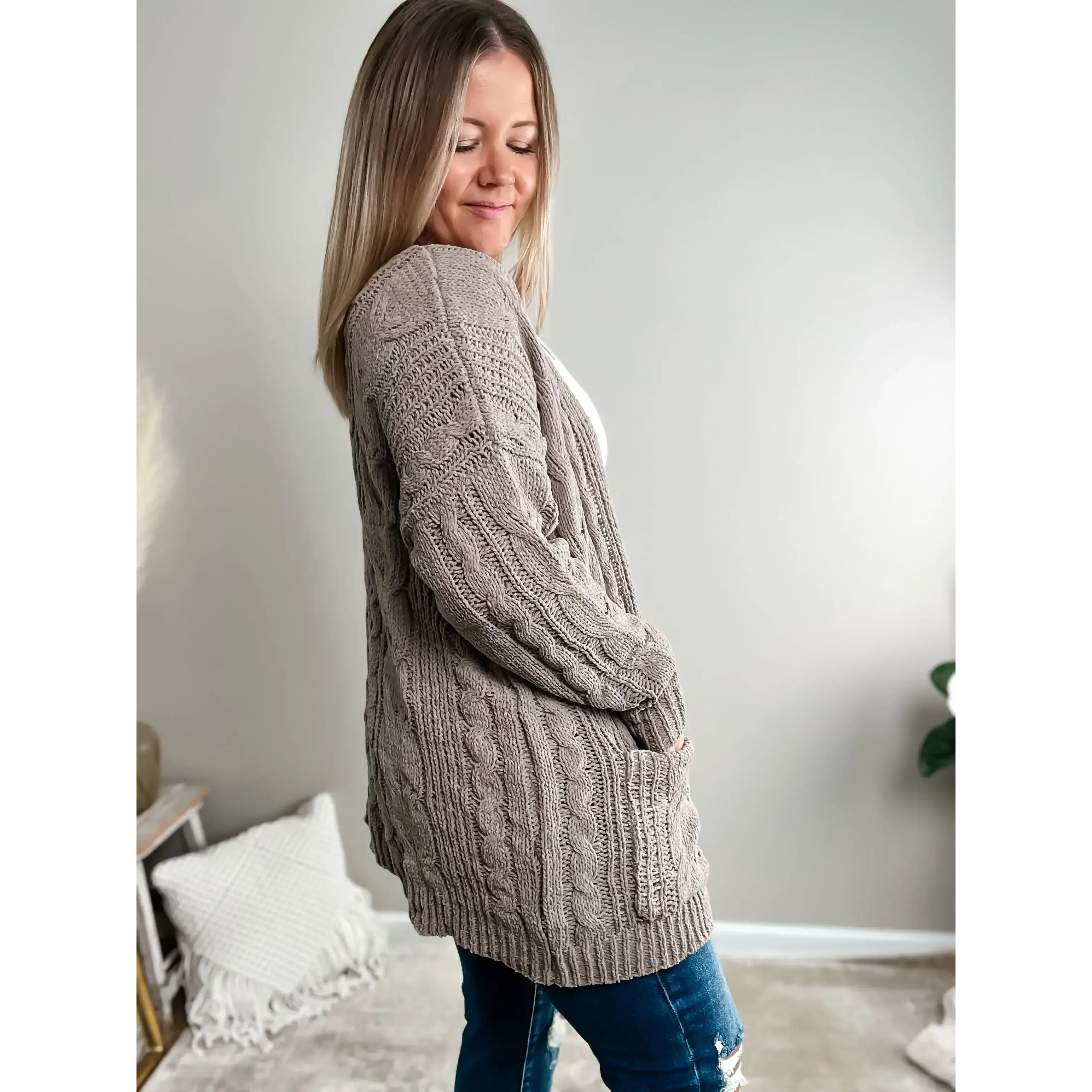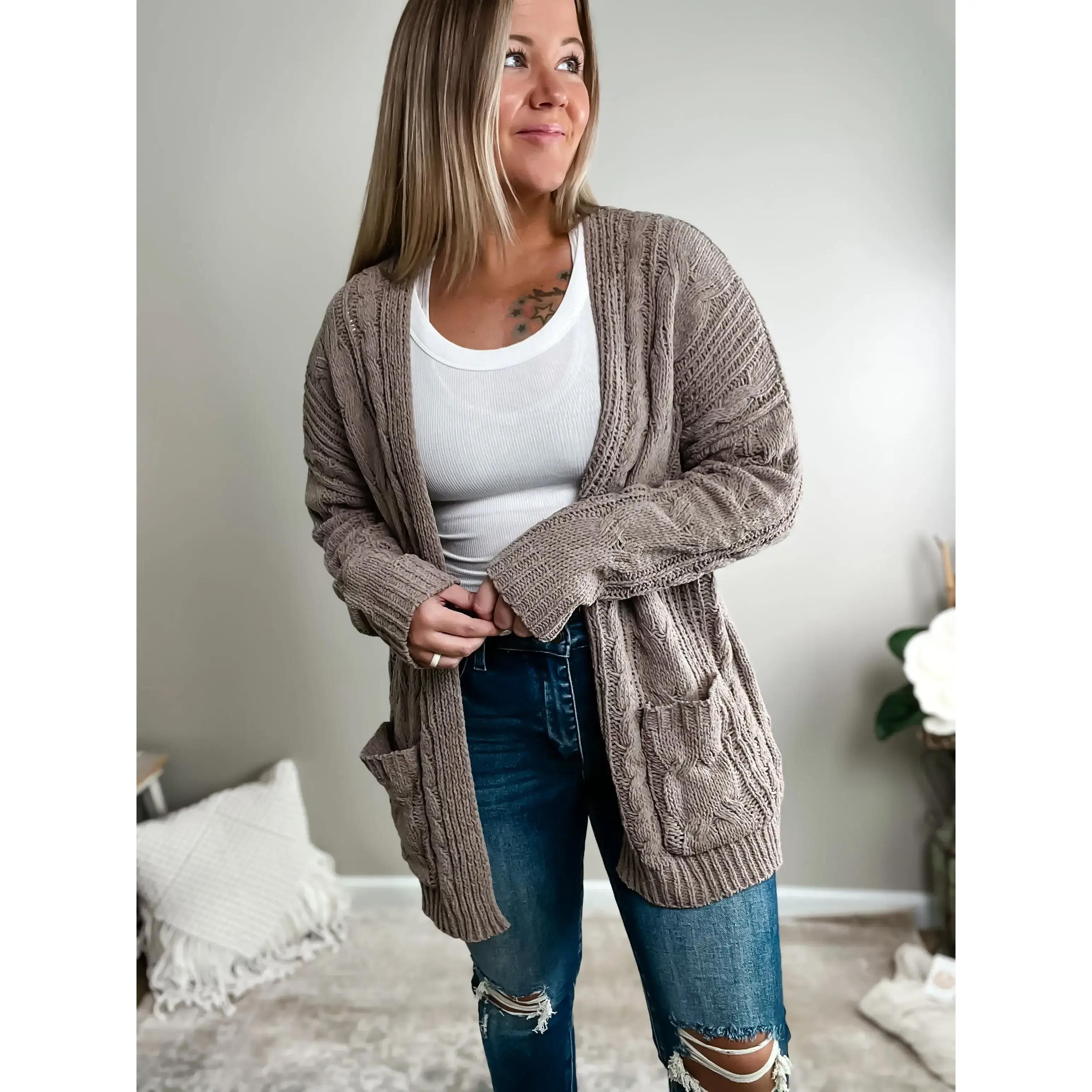 Cardigans are a classic staple, and we love the cozy cable knit texture that sets this one apart. A versatile layering piece that can be styled so many ways!