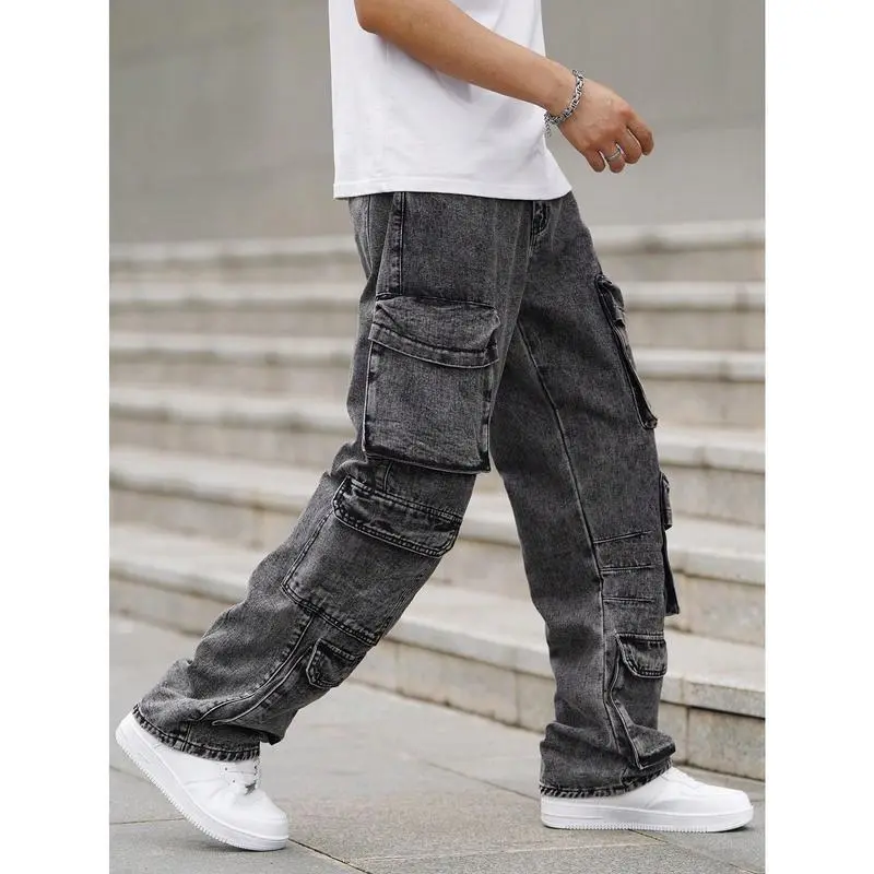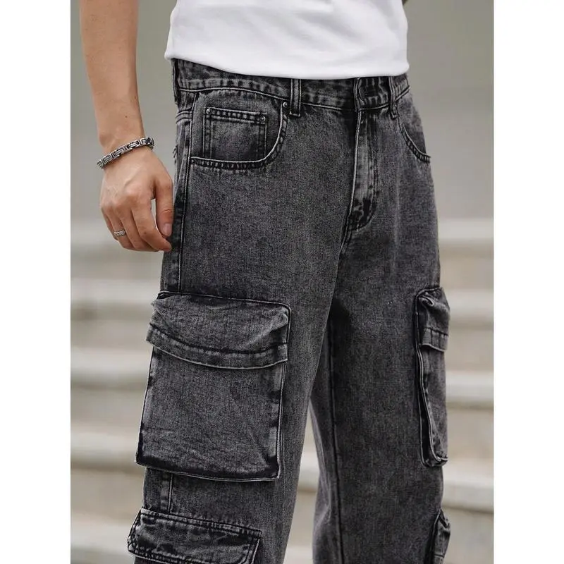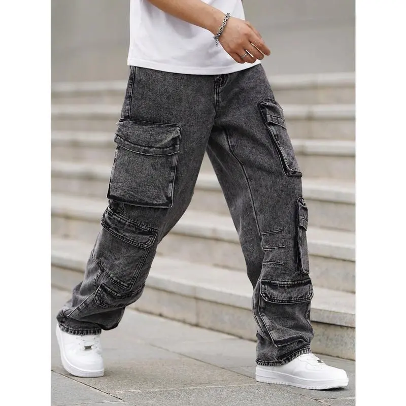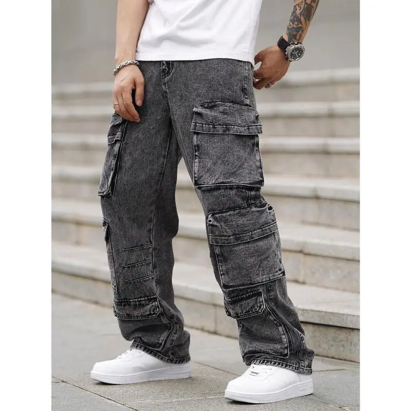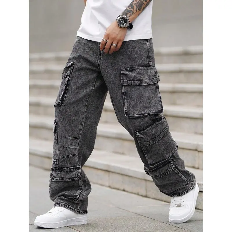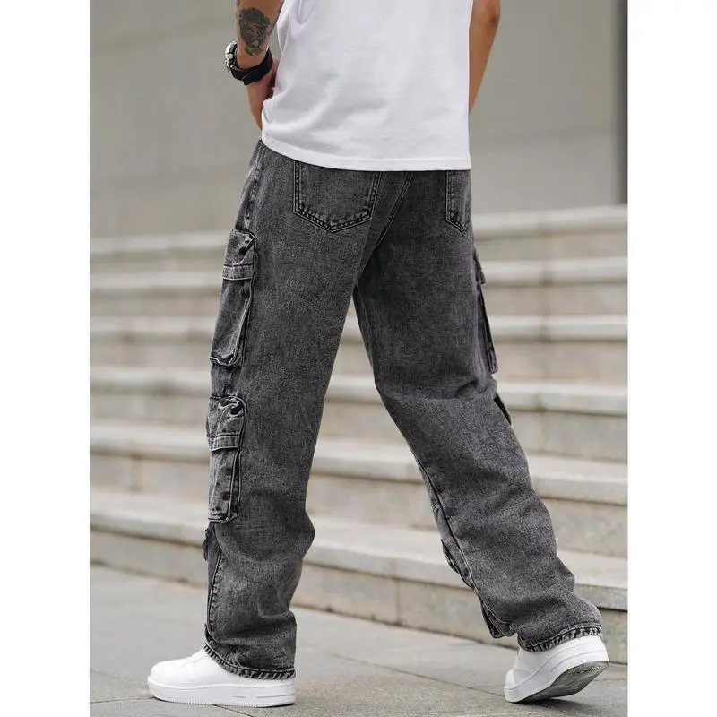 EMRGMenLooseFitWideLegJeansWithMultipleUtilityPockets,CasualWorkwear,PlainLongBaggyCargoDarkGreyAcidWashCargoJeans,ForHusband,BoyfriendGiftsjeansmenmen'sjeansPantsStreetwearDenimMenswearsalvagejeans