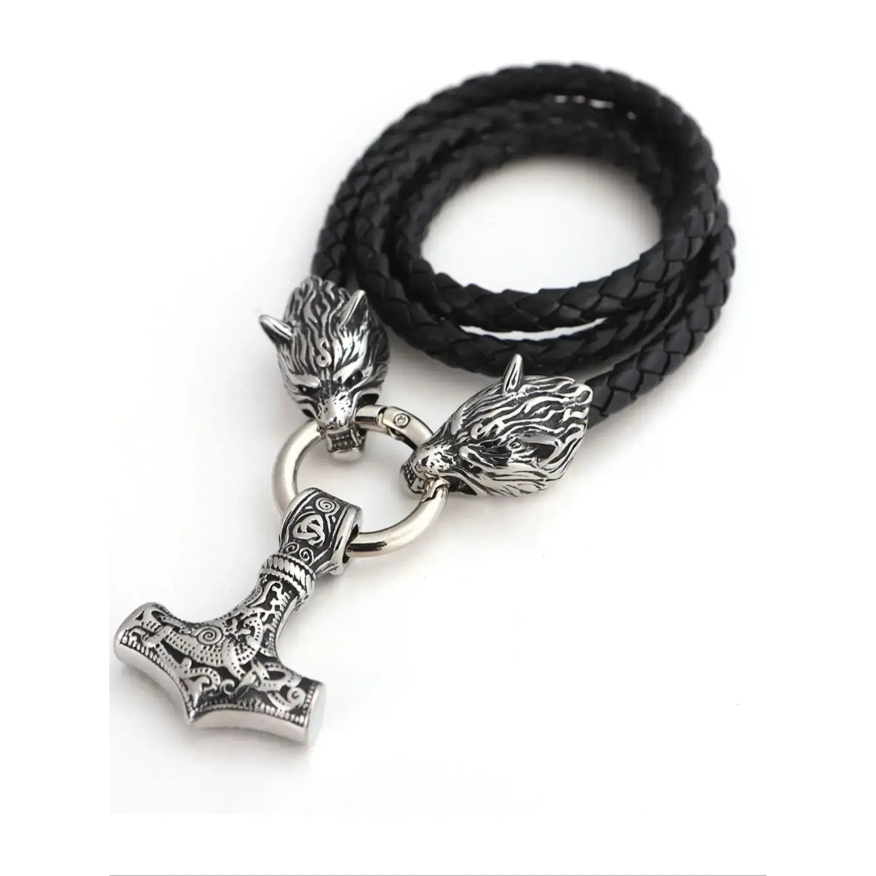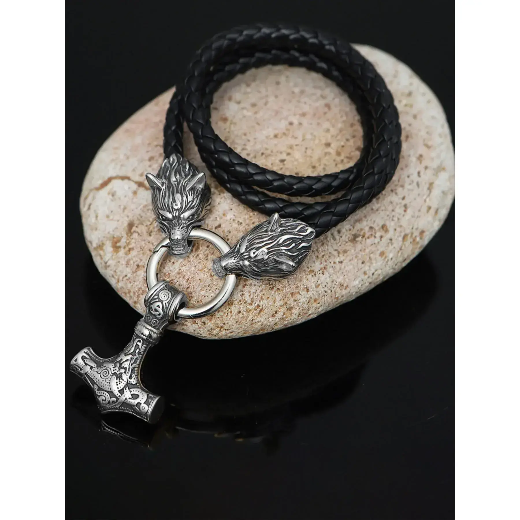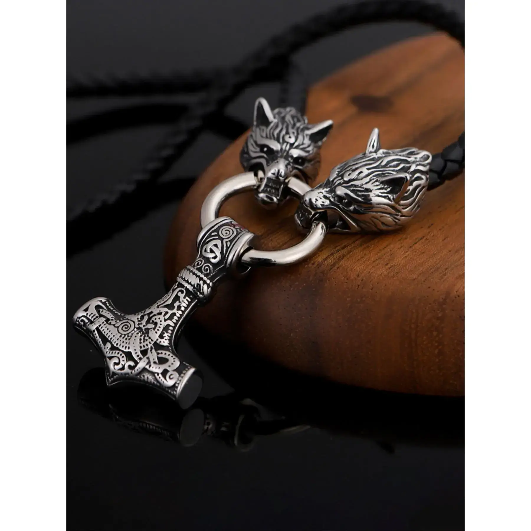 Vintage Viking Hammer Wolf Design Pendant Necklace, Punk Jewelry for Party, Daily Clothing Decor, Trendy Pu Leather Strap Jewelry for Birthday Gift without Box