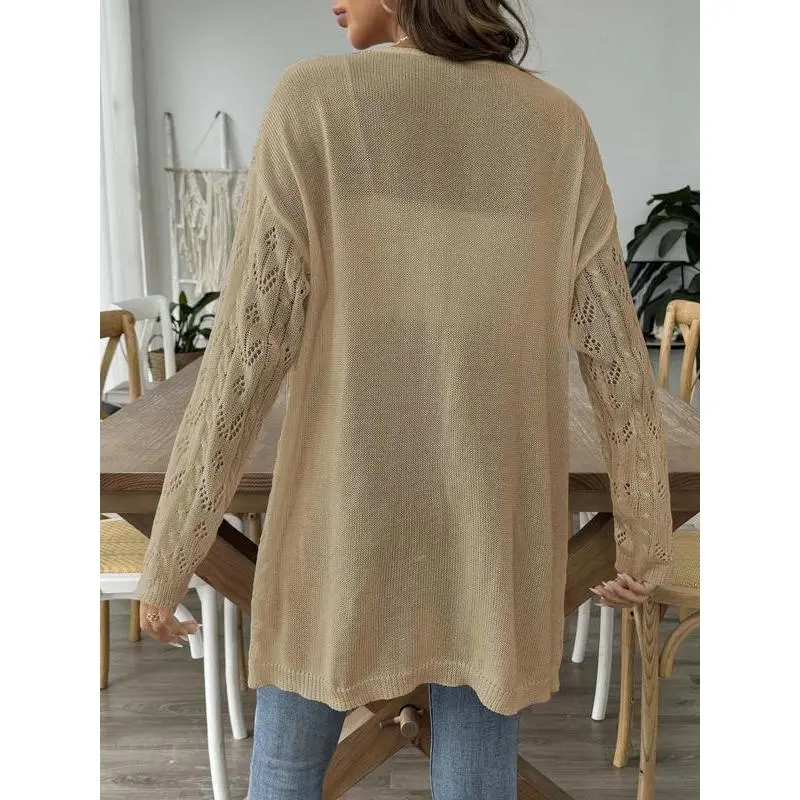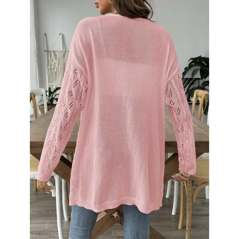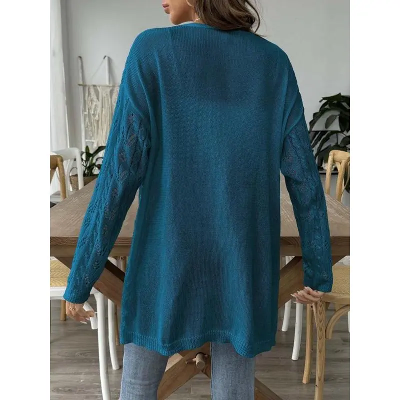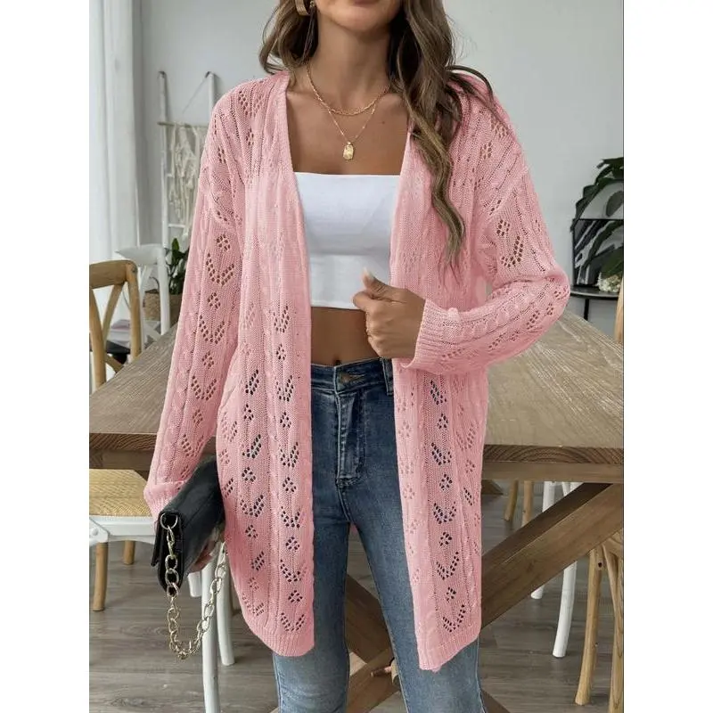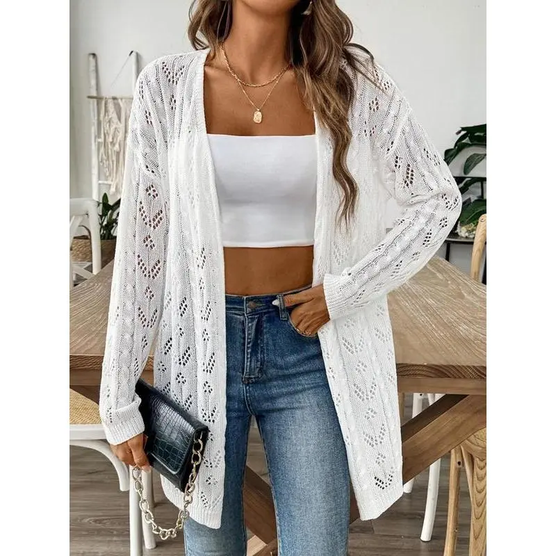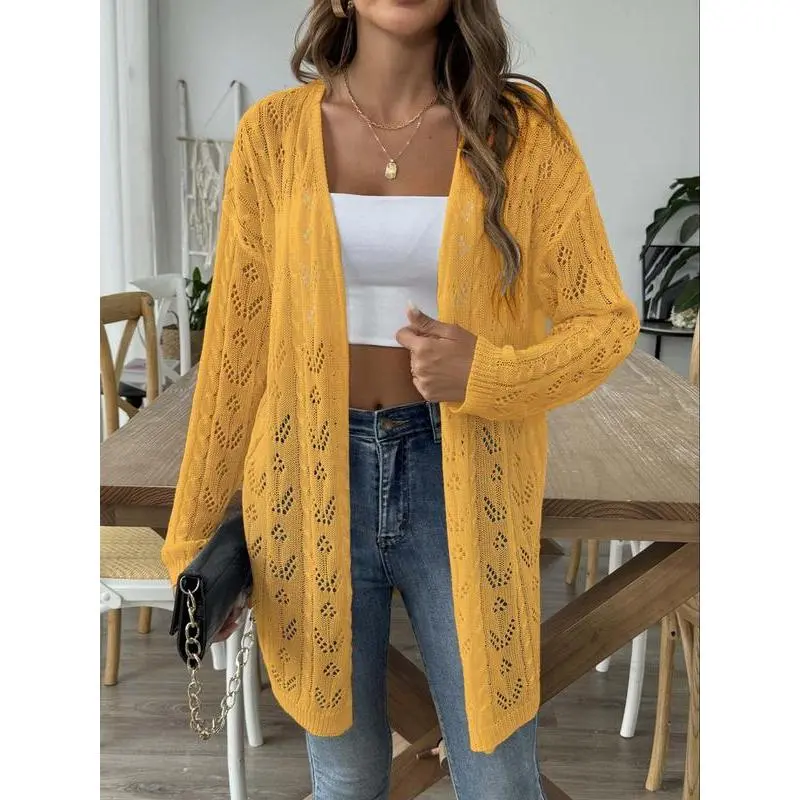 Women's Solid Color Hollow Out Open Front Crop Cover Up Sweater, Casual Long Sleeve Knitwear for Beach Holiday Vacation, Ladies Clothes for All Seasons